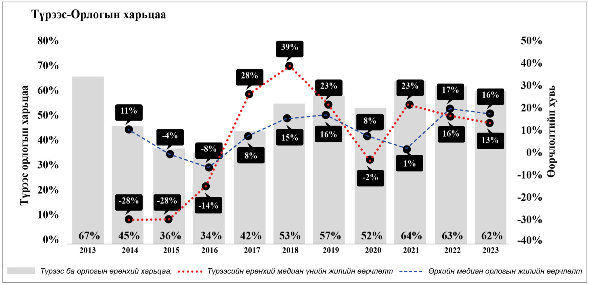 Энэ нь нэг өрх орлогынхоо 2/3-ыг түрээсэнд зарцуулдаг гэсэн тооцоо гарч байв. Гэхдээ энэ харьцаа 2016 онд хөтөлбөр хэрэгжсэнээр зээл олгож орон сууцны нийлүүлэлт сайжирснаар энэ харьцаа 34 хувь хүрч зохистой харьцаа руу ойртжээ. 2017 оноос түрээс орлогын харьцааны үзүүлэлт эргэн өссөн. Орлогын өсөлттэй харьцуулахад түрээсийн үнэ илүү нэмэгдсэн. Гэвч 2023 онд энэ харьцаа 62 болж түрээсийн төлбөрийн дарамт их их гэсэн ангилалд багтжээ. Уг олон улсын зохистой түвшинд хүрэхэд түрээсийн үнэ хоёр дахин буурах эсвэл өрхийн орлогыг хоёр дахин өсгөх хэрэгцээ үүсжээ. Зохистой түвшин 34 хувь. 2018 онд түрээсийн сарын медиан үнэ дунджаар 481-711 мянган гаруй төгрөгөөр нэмэгдэж 2024 оныхоор энэ дүн 40 орчим хувиар нэмэгдсэн байна. Энэ нь ойролцоогоор 1-2 өрөө байрны медиан үнэ байршлаас шалтгаалан 1.3-1.5 сая төгрөг байна. Нөгөөтээгүүр,үнэ-түрээсийн харьцаа 12.6 буюу 12 жилийн түрээсийн төлбөрөөр дундаж орон сууц худалдан авах сонголтыг хийхээр байна. Гэхдээ орон сууцны санхүүжилт болон нийлүүлэлт хязгаарлагдмал байгаагаас түрээсийн үнэ өндөр хэвээр байна.