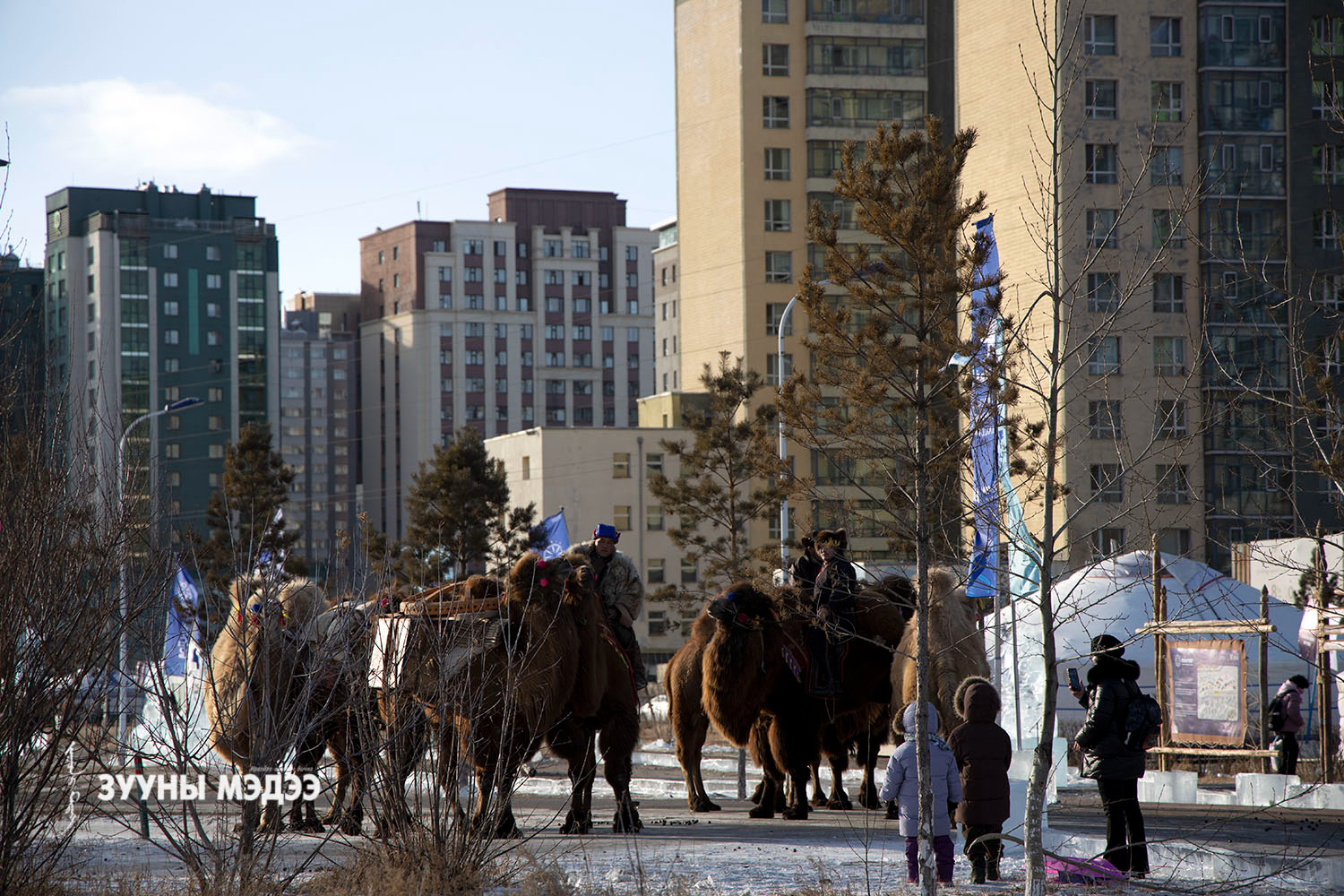 Өмнөговь аймгийн Ханхонгор сумын Өгөөмөр багийн залуу малчин Ж.Шинэбат тэмээний уналга, ачилга, эдлэл хэрэглэл, ахуй соёлыг түгээн дэлгэрүүлэхээр нутгийн ах, эхнэрийн хамт найман тэмээтэй "Монгол нүүдэлчин" наадамд оролцож байна.