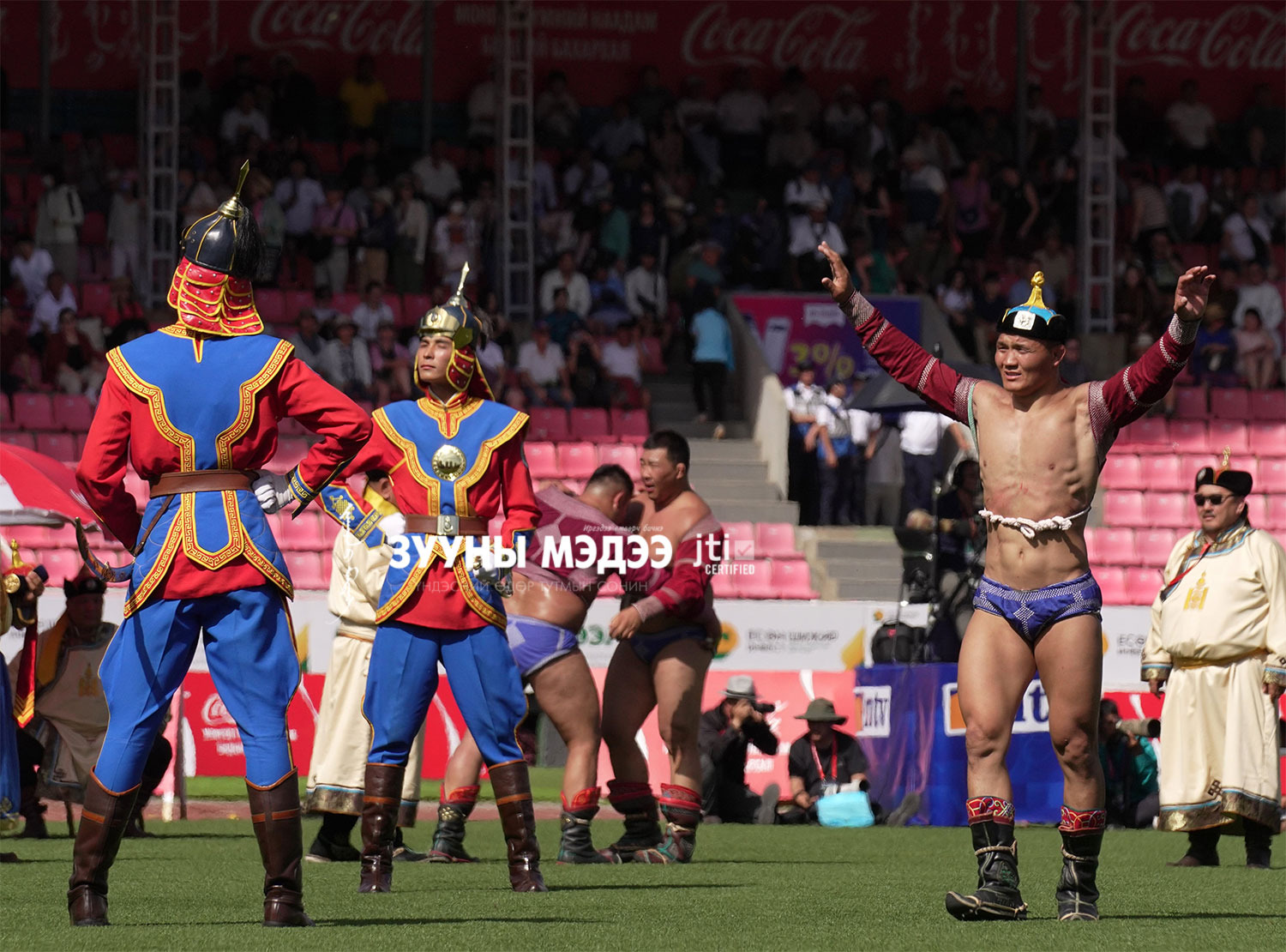 Есөн хөлт цагаан тугаа нар зөв тойрон дэвэх эр бяр нь тэгширсэн хүчит бөхчүүд төрийн наадмын зүлэг ногоон дэвжээнд тавын даваанаас эхлэн улсын цолны босго алхан наадамчин олноо баясгана. Энэ жилийн наадамд зургаан шинэ улсын цолтон төрлөө.