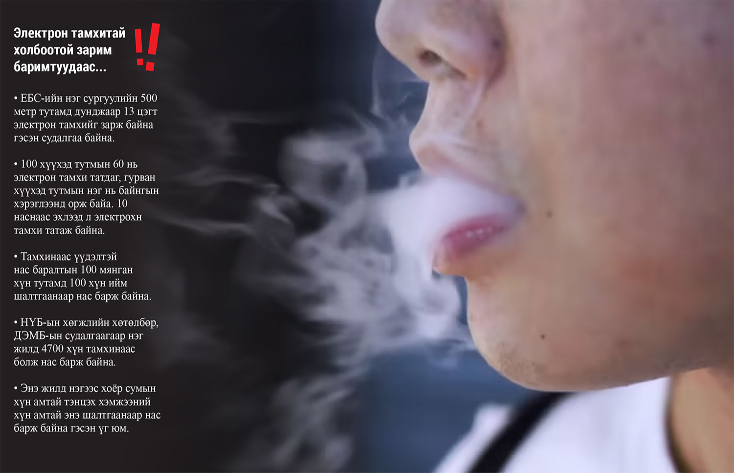 Гудамжаар зөрөх хүүхдүүд хээв нэг утаа баагиулан өнгөрч, булан болгонд бөөгнөрч зогсох сурагчид гартаа барьсан “vape” нэртэй жижигхэн төхөөрөмжөө ам руугаа хийн сорох нь хэзээнээс эхлээд юм мэдэхгүй, нэг л мэдэхэд бидэнд танил дүр төрх болжээ. Ялангуяа өсвөр насныхны электрон тамхины хэрэглээ эцэг эхчүүд, багш нар, нийгмийн хувьд хамгийн эмзэг сэдэв болоод байгаа. Сүүлийн үед хийгдэж байгаа олон судалгаагаар өсвөр насныхны хэрэглээ их байгаа үр дүнгүүд шил дараалан гарсаар байна. Жишээ нь ЭМШУИС-иас 15-17 насны сурагчдын дунд хийсэн нэгэн судалгаанд оролцогчдын 30 орчим хувь нь “өдөр тутамдаа vape татдаг” гэсэн бол 60 орчим хувь нь “татаж үзсэн” гэж хариулжээ.