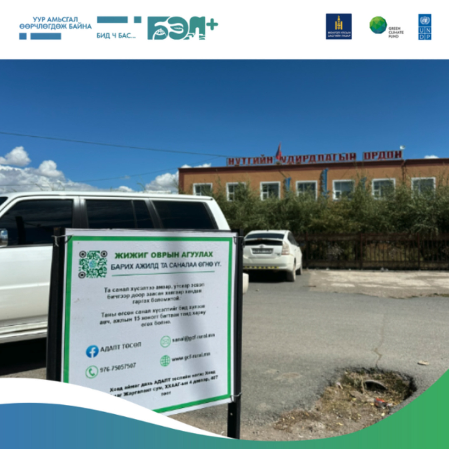 Гэхдээ зөвхөн мэдээллээр хангаад зогсохгүй, олон улсын байгууллагуудын сайн туршлагаас нэвтрүүлэх, Монголын газар нутаг, байгаль экологийн олон янз байдалд тохирсон ажлуудыг хамтран хэрэгжүүлэх талаар дурдсан билээ. Ингээд Уур амьсгалын Ногоон сангийн санхүүжилтээр Монгол Улсын Засгийн газар НҮБ-ын Хөгжлийн Хөтөлбөрийн дэмжлэгтэйгээр “Монгол орны хөдөөгийн иргэдийн уур амьсгалын өөрчлөлтөд дасан зохицох чадамж болон эрсдэлийн менежментийг боловсронгуй болгох нь” буюу АДАПТ төслийг 2021 оноос эхлэн Ховд, Завхан, Дорнод, Сүхбаатар аймагт хэрэгжүүлж байна. Байгалийн давагдашгүй хүчин зүйл, хүний үйл ажиллагааны сөрөг нөлөө зэрэгт хамгийн их өртсөн, яаралтай арга хэмжээ авах шаардлагатай нь байгаль орчны үнэлгээ, нарийвчилсан судалгаагаар тогтоогдсон дээрх аймгуудын 68 сумын иргэд уг төслөөс эерэг үр дүн хүртсээр байна.