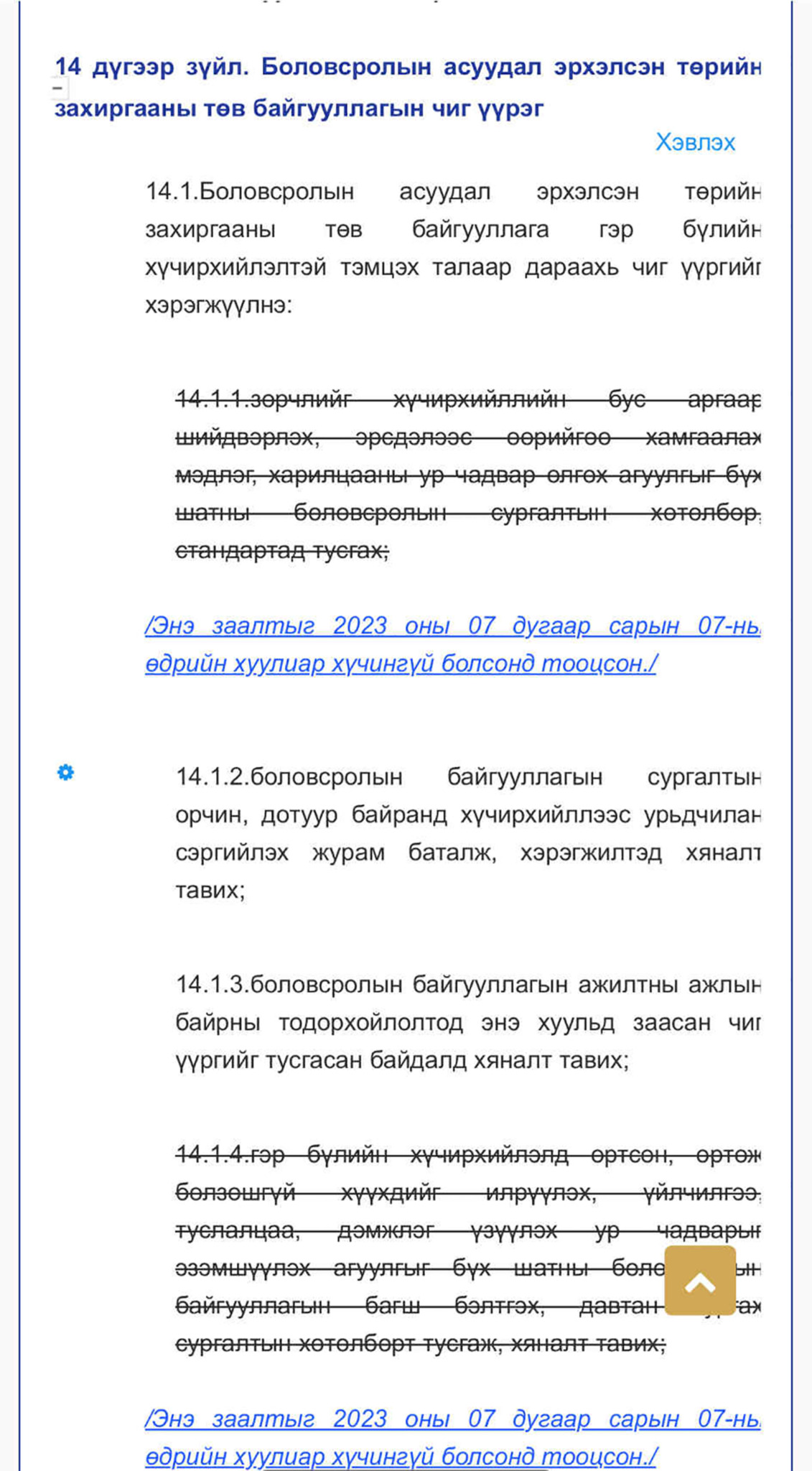 14.1.3.боловсролын байгууллагын ажилтны ажлын байрны тодорхойлолтод энэ хуульд заасан чиг үүргийг тусгасан байдалд хяналт тавих гэсэн байдаг.