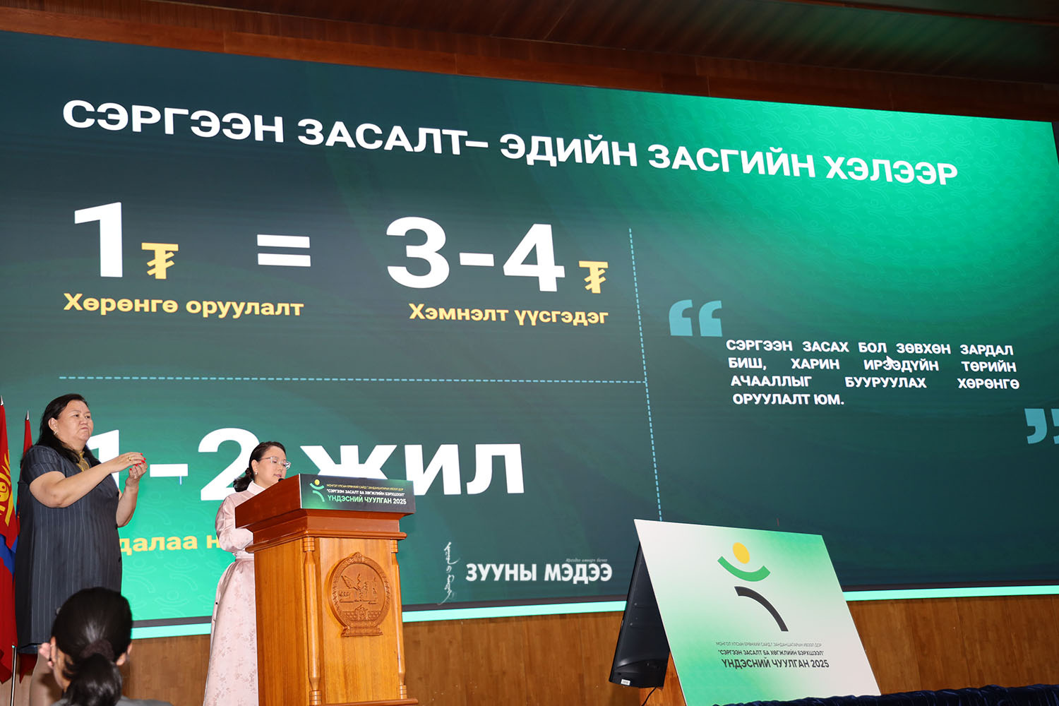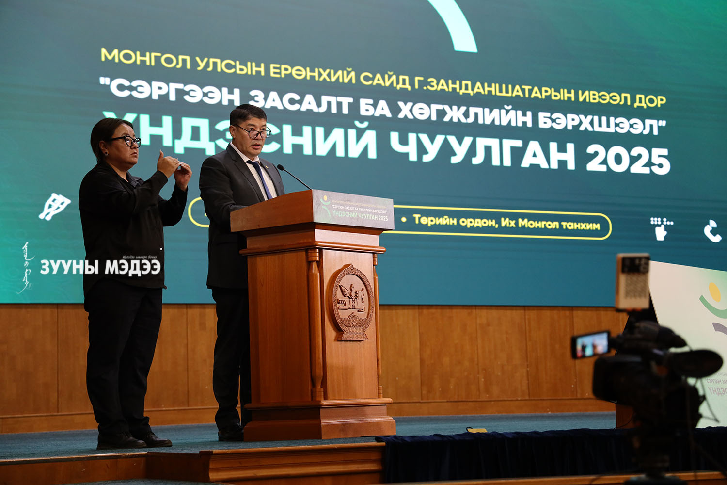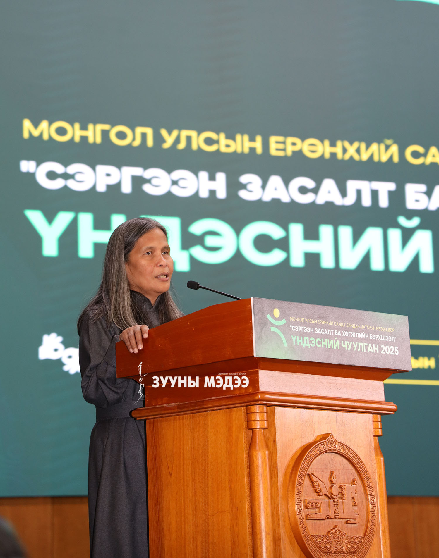 "Сэргээн засалт ба хөгжлийн бэрхшээл" үндэсний чуулганыг УИХ-ын гишүүн, нийгмийн эрүүл мэндийн ухааны доктор О.Саранчулууны санаачилгаар Ерөнхий сайд Г.Занданшатарын ивээл дор Гэр бүл, хөдөлмөр, нийгмийн хамгааллын яам, Эрүүл мэндийн яам, Бие бялдар сэргээн засах судлалын Монголын нийгэмлэг, "Тэгш нийгэм холбоо" ТББ хамтран зохион байгуулж байна. Үндэсний чуулганд нийслэлийн есөн дүүрэг, 21 аймгаас 500 гаруй төлөөлөл оролцож байна. Энэ тухай гэрэл зургийн сурвалжилгаас харна уу.