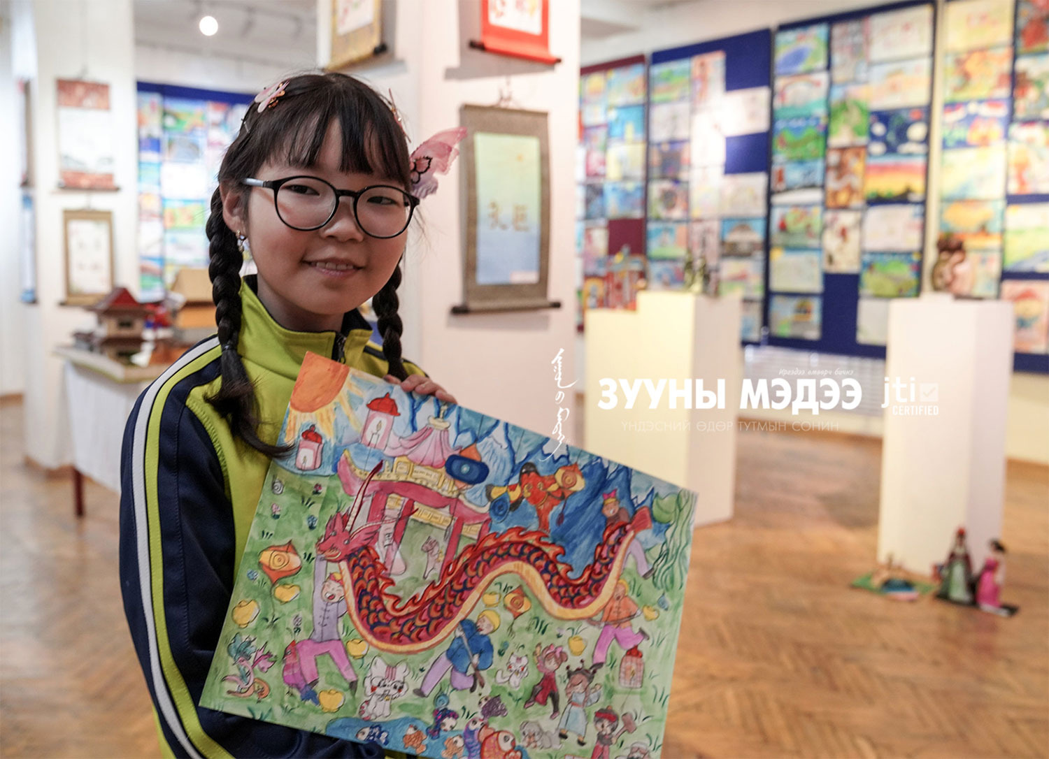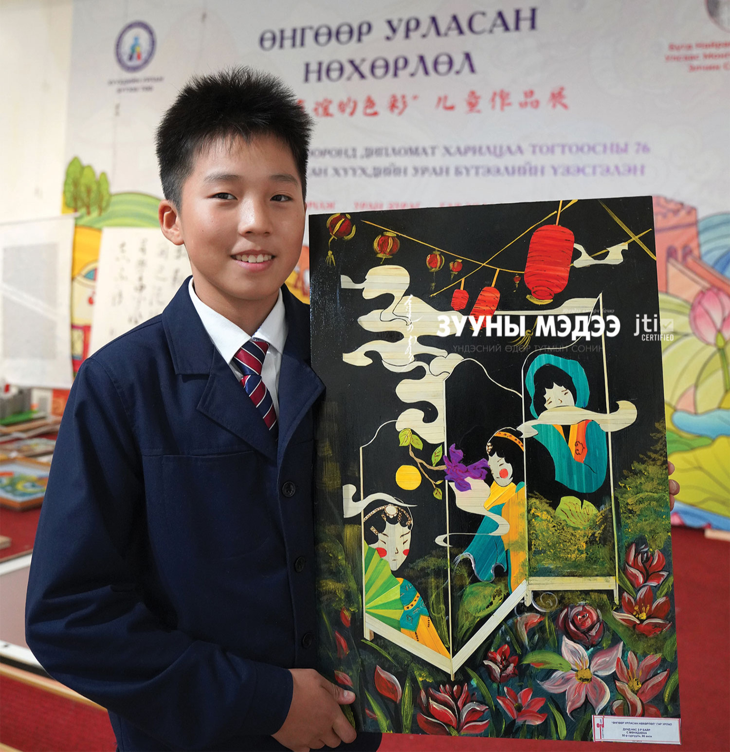 “Манай багшийн нэр хэлэхэд жаахан хэцүү. Би “Миний төсөөллийн Хятад орон” сэдэвт зургаараа бага насны ангилалд түрүүлсэндээ баяртай байна. “Youtube”-ээс Хятадын тухай бичлэг үзэж байгаад зурсан. Хүүхдүүд луун бүжгээ бүжиглэж, цаасан шувуу хийсгэж байгаа үйлдлүүдийг дүрсэлсэн. Толгойгоо сайн ажиллуулж, бодож байгаад зурдаг. Аав маань чулуун дээр юм бичдэг. Би аавыгаа дуурайсан".