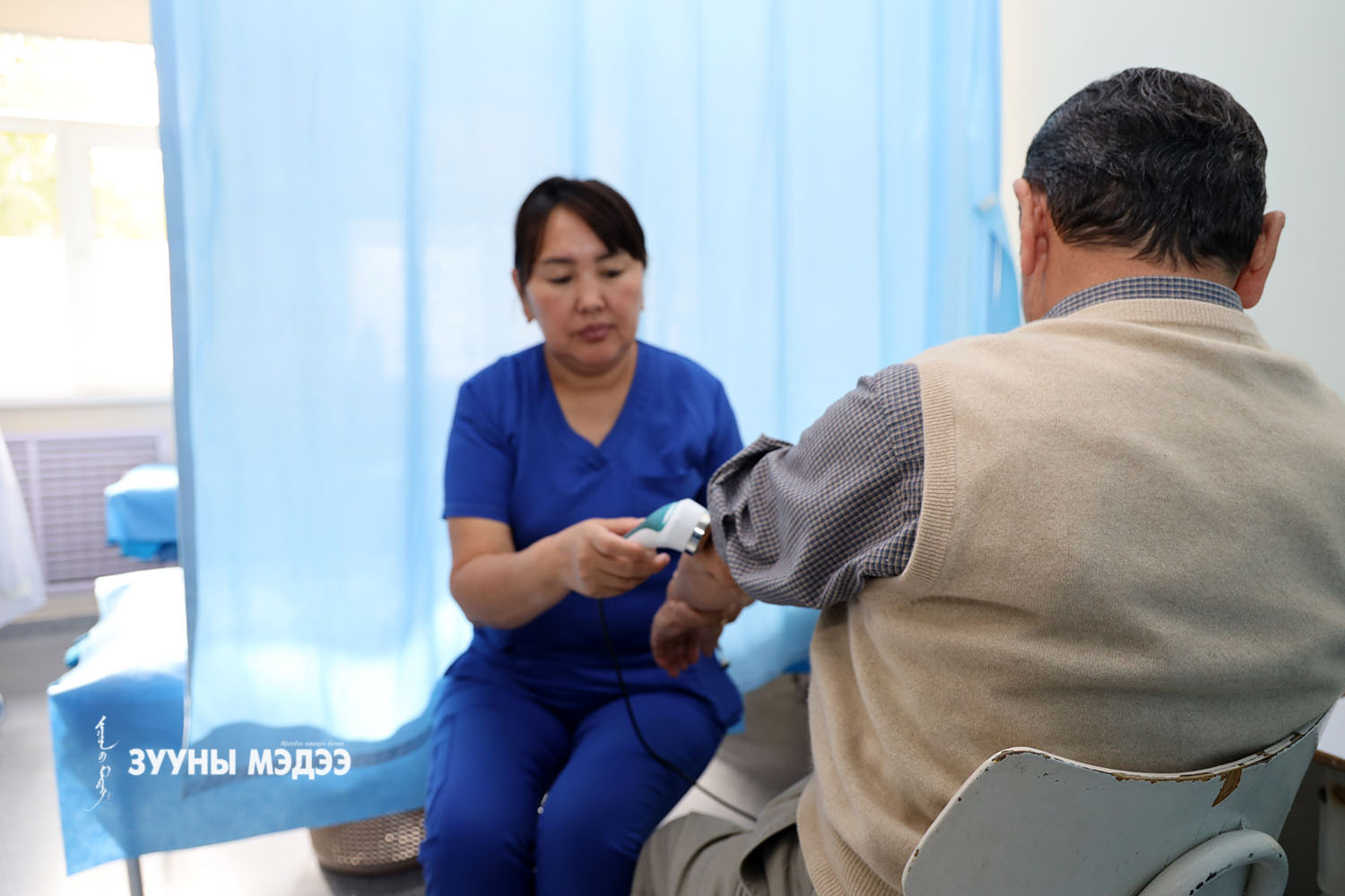 Сэргээн засах, уламжлалт эмчилгээний тасгийн сувилагч нурууны өвчтэй хүмүүст лаан эмчилгээ хийж буй нь.