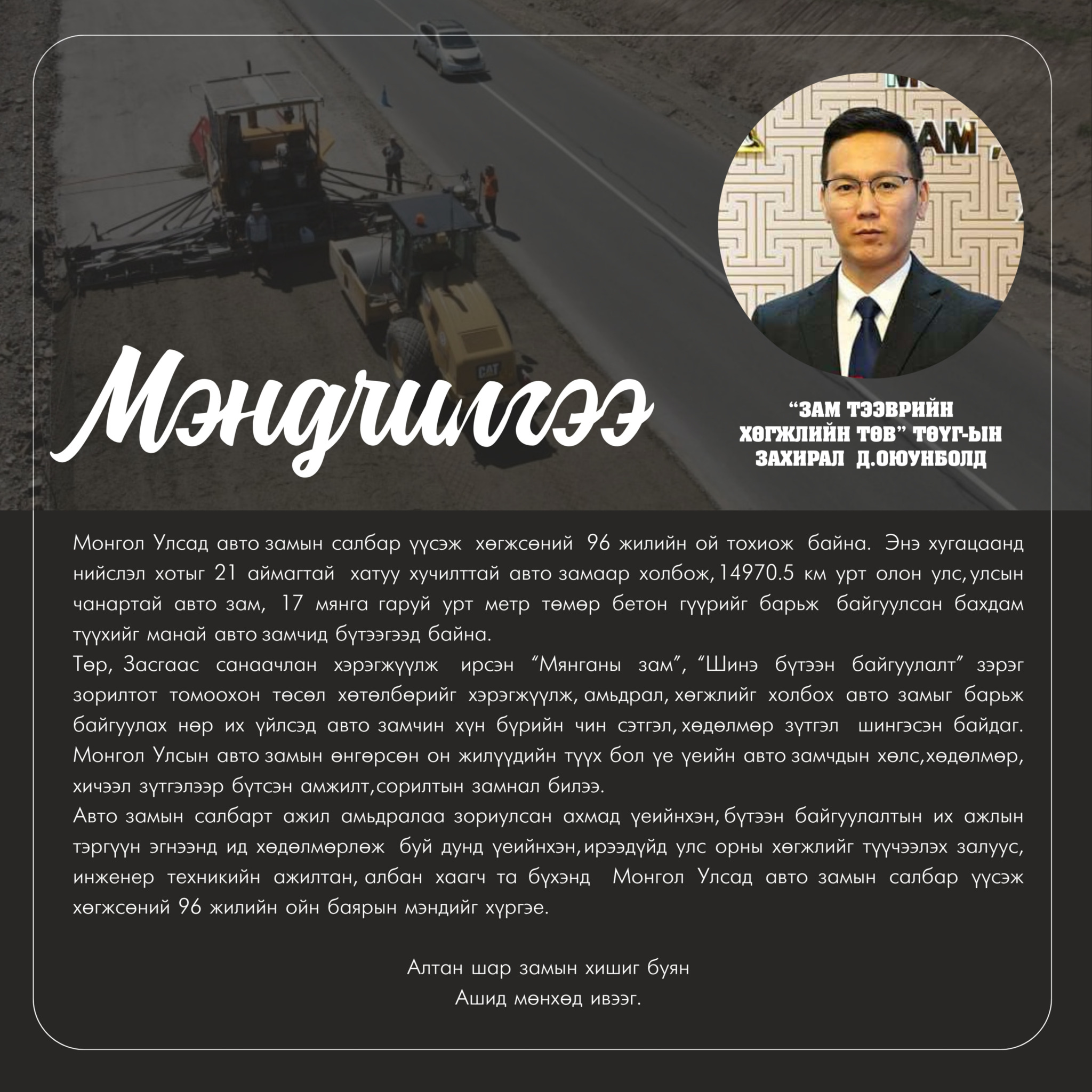 Монголчууд бид дэлхийн хуурай газрын бараг нэг хувьтай тэнцэх хэмжээний, өргөн уудам тал нутагтай. Эрт цагт тэмээн жин, морин тэрэгний мөрөөр буюу шороон замаар хот суурин хооронд холбогддог байсан. Тэгвэл хот хөдөөгийн алс зайг ойртуулж, шороон замын тоосноос өнөөдрийн тэгш хучилттай зам хүртэлх хөгжил бол үе үеийн бүтээн байгуулагчдын хичээл зүтгэлийн гэрч юм. Тэгвэл Монгол Улсад Авто замын салбар үүсэж хөгжсөний 96 жилийн ой өнөөдөр тохиож байна.
