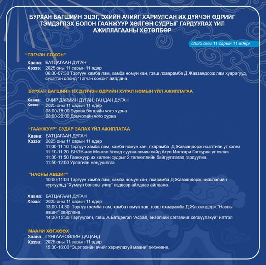 Энэхүү өдөрт Монголын бурхан шашны төв Гандантэгчэнлин хийдэд тэмдэглэх үйл ажиллагааны хөтөлбөрийг сүсэгтэн олон та бүхэнд толилуулж байна.