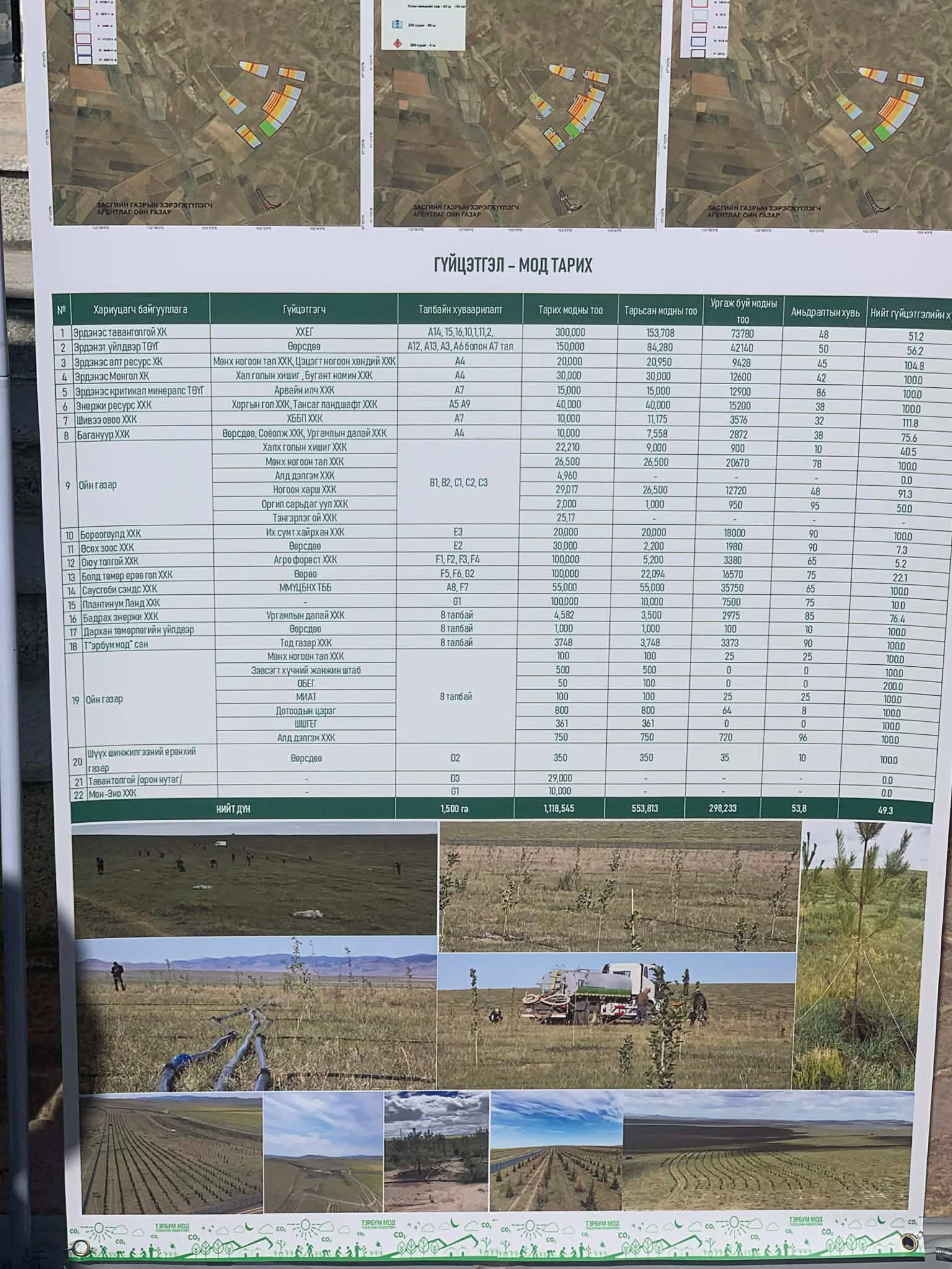 Зарим компани 50 тонны багтаамжтай танк тавьсан хэдий ч худаг нь цагт 3.0 тонныг өгөөд тасарчихдаг гэдгийг бүгд ярьсан. Энд “Эрдэнэс Монгол” нэгдлийн зургаан компани мод тарьсан. Үүнд “Эрдэнэс таван толгой” ХК /300 мянган мод/, “Эрдэнэт үйлдвэр” ТӨҮГ /150 мянга/, “Эрдэнэс алт ресурс”/20 мянга/, “Эрдэнэс Монгол” ХК/30.000/, “Эрдэнэс критикал минералс” ТӨҮГ /15000/, “Энержи ресурс”ХХК/40.000/, “Шивээ овоо”/10 мянга/, “Багануур”ХХК /10000/ зэрэг болно. Эдгээрийн ургалтын хувь ойролцоогоор 38-86 хувь байсан. Энэ нь тухайн компаниудын усалгаа муу байсны зэрэгцээ арчилгаанаас бас шалтгаалсныг дурдах нь зүйтэй. Хөгшин Орхон голын ус татарсан. Түүнчлэн тэр хавийн хөндийн гадаргын усны ундарга муу гэдгийг мэргэжилтнүүд сануулсаар байсан хэдий ч усны ерөнхий судалгааг хийгээгүйтэй холбоотой болов. Яагаад усны нөөц ундарга муу газарт олон сая мод тарих болов. Төсвийн мөнгө уйлдаггүй гэдгийн үлгэр энд болжээ.