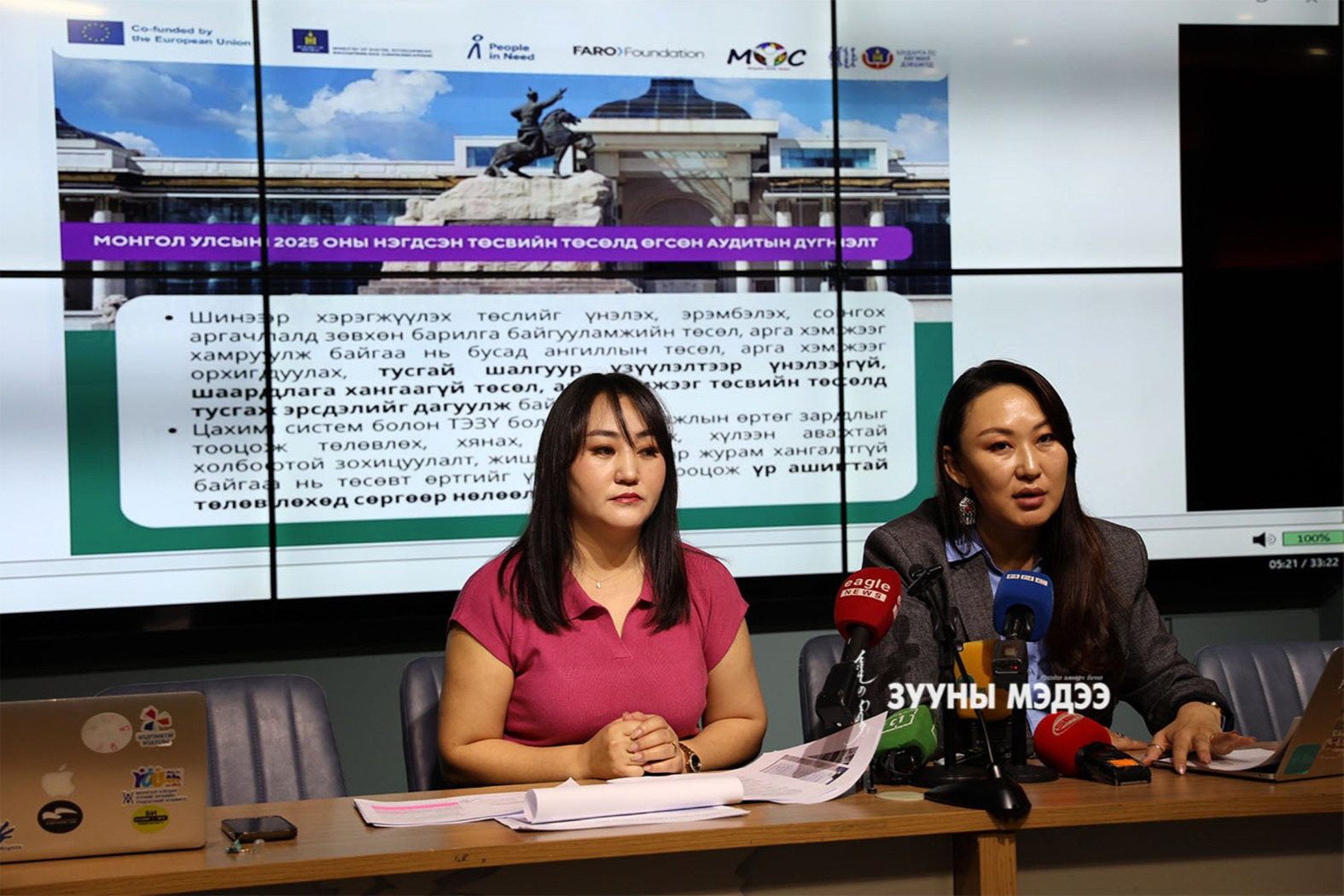 Нийслэлийн 2026 оны төсвийн төсөлд хийсэн дүн шинжилгээний талаар өнөөдөр “Үндэсний мэдээллийн төв”-д “Монголын залуучуудын эвсэл” ТББ-ын төлөөлөл болох Ж.Амарзаяа, З.Энхбаяр нар мэдээлэл хийсэн юм. Тэд мэдээлэлдээ “Сүүлийн жилүүдэд нийслэлийн төсөвт гэмт хэргийг бууруулахад зарцуулах төсөв өссөн дүнтэй байгаа хэдий ч үр дүнд нь гэмт хэргийн тоо буурах биш нэмэгдсээр байна. Тухайлбал,2022 онд гэмт хэргийн тоо 24310 байсан бол 2024 онд 32 мянга болж өссөн. Гэмт хэргээс урьдчилсан сэргийлэх болон бусад хөтөлбөрийн үр дүнг хувиар илэрхийлэх ёстой. Гэвч шалгуур үзүүлэлт, чанарыг бүхэл тоогоор илэрхийлж байгаа нь буруу юм гэсэн юм. Мөн “2023 онд Гэмт хэргээс урьдчилан сэргийлэхэд чиглэсэн тусгай хэрэгсэл болох скүүтер тоног төхөөрөмжийн зардалд 5.0 тэрбум төгрөг төсөвлөсөн ч гэмт хэргийн тоо буураагүй. Өөрөөр хэлбэл 5.0 тэрбум төгрөгт цагаадаагийн албан хаагчдад хөл дээрээ зогсоод зорчих цахилгаан скүүтер нийлүүлсэн нь үр дүнгүй зардал болжээ. Мөн 3.0 тэрбум төгрөгт боловсрол болон эрүүл мэндийн салбарт тоног төхөөрөмжүүд авсан ч түүнийг ажиллуулах хүний нөөц, чадавхын асуудлаас болж агуулахад хадгалаастай байх тохиолдлууд байсан” гэсэн юм. Түүнчлэн мега төслүүд бодит тооцоолол дээр тулгуурлаагүй зөрчлүүд илэрсэн гэлээ. 2026 онд Нийслэлийн төсөвт 4.0 их наяд 637.5 тэрбум төгрөгийн орлогоо төвлөрүүлэхээр төлөвлөсөн нь өмнөх оны батлагдсанаас 9.4 хувиар өссөн дүн юм. Харин төсвийн зардлыг 5.8 тэрбум төгрөг буюу өмнөх оны батлагдсан төсвөөс 2.4 тэрбум төгрөгөөр буурсан байна. Нийслэл тэвчиж болох нэг удаагийн шинжтэй нийт 3.5 тэрбум төгрөгийн зардал байна. Мөн бусдаар гүйцэтгүүлэх, ажил үйлчилгээний төлбөр хураамж 3.0 тэрбум, сургалтын зардалд 700 сая, нийслэлийн орон сууц дэд бүтцийг хөгжүүлэх арга хэмжээ нэршилтэй ТЭЗҮ болон зураг төсөлгүй 20 тэрбум төгрөгийн төсөл арга хэмжээ зэрэг нийт 27.5 тэрбум төгрөгийн зардлыг бууруулах боломжтой гэлээ. Түүнчлэн хиймэл оюун ухаан ашиглахад 9.4 тэрбум төгрөг төсөвлөсөн. Нийслэлийн иргэдэд мэдээлэл өгөх цахим сайт нь ажиллахгүй, дэд бүтэц өгөгдөл нь бэлэн болоогүй байхад өндөр дүнтэй төсөв төсөвлөсөн. Иргэдийг төөрөгдүүлэх мэдээлэл өгдөг” гэх зэргээр нэмж тайлбарласан юм. Мөн төлөвлөлтийн шаардлага хангаагүй, ТЭЗҮ-гүй мега төслүүдийг төсвийн төсөлд тусгахгүй байхыг зөвлөжээ.