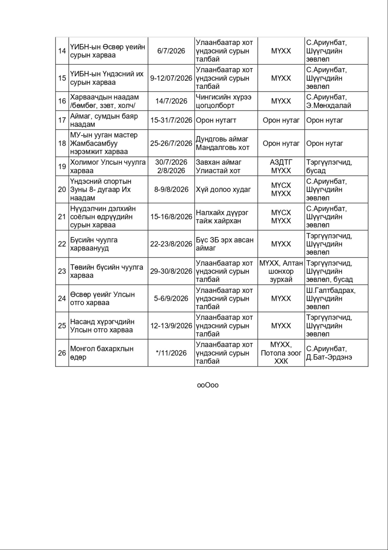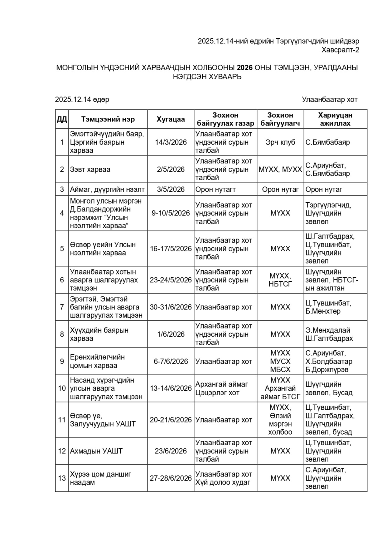 2026 оны үйл ажиллагааны төлөвлөгөө, тэмцээн уралдааны хуваарь: