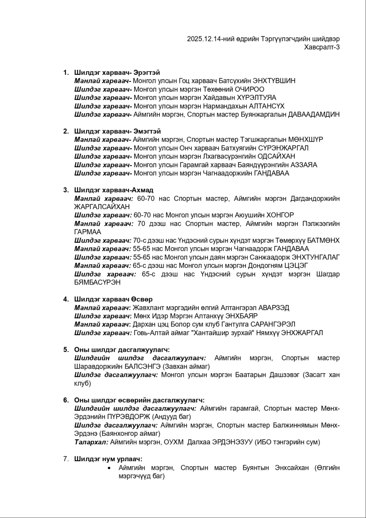 Монголын үндэсний харваачдын холбооны тэргүүлэгчдийн 2025 оны арванхоёрдугаар сарын 14-ний өдрийн ээлжит хуралдаанаар боллоо. Тус хуралдаанаар дараах шийдвэрүүдийг гаргажээ. Тодруулбал, Холбооны тэргүүлэгч гишүүнээр ажиллах хүсэлт өгсөн долоон хүнээс спортын мастер, МҮХХ-ын ёс зүйн хорооны гишүүн Баатарын Ууганбаяр, МҮОНРТ-ийн MNB спорт сувгийн сэтгүүлч Гарьдшувуугийн Отгонжаргал нарыг сонгосон байна. Мөн 2026 оны үйл ажиллагааны төлөвлөгөө, тэмцээн уралдааны хуваарийн батлан гаргажээ. Түүнчлэн холбооны 2025 оны шилдгүүдийг тодруулсан байна.