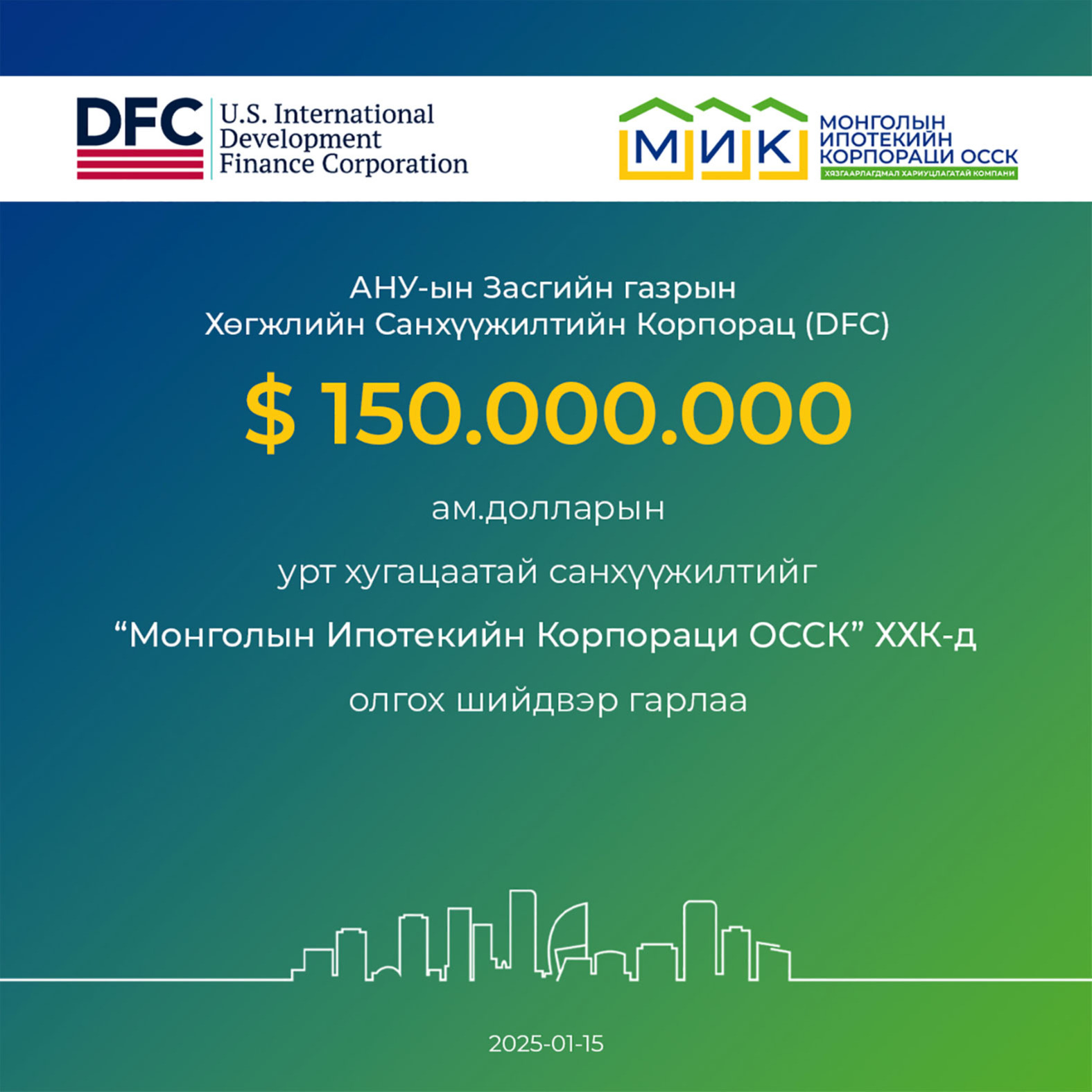 1. “Монголын Ипотекийн Корпораци ОССК” ХХК (МИК)-д Америкийн Нэгдсэн Улсын Хөгжлийн Санхүүжилтийн Байгууллагаас (DFC) 150 сая ам.долларын санхүүжилтийн эх үүсвэрийг урт хугацаатайгаар олгох шийдвэрийг 2025 оны 1 дүгээр сарын 15-ны өдөр гаргалаа.