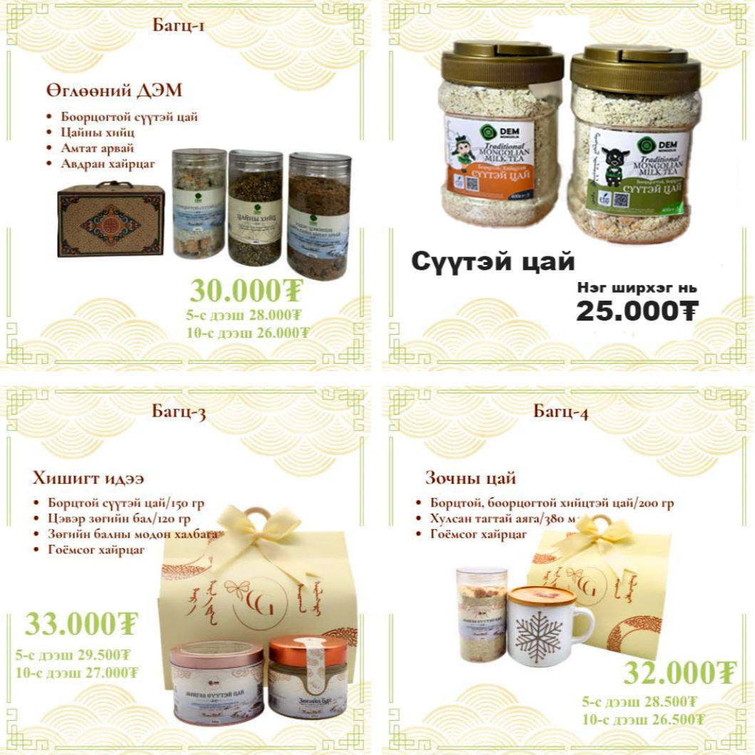Энэ жилийн цагаан сарын баярын бэлгийн багцад "Дэм" органик хүнс брэнд нь цай, цайны хийц, арвайн амттан гурван бүтээгдэхүүнээ онцолж санал болгож байна. Учир нь цайндаа бонзын үнэлгээ хийлгэж ESG баталгаажуулалттай болсон нь Монголдоо анхдагч стандарттай бүтээгдэхүүн юм.