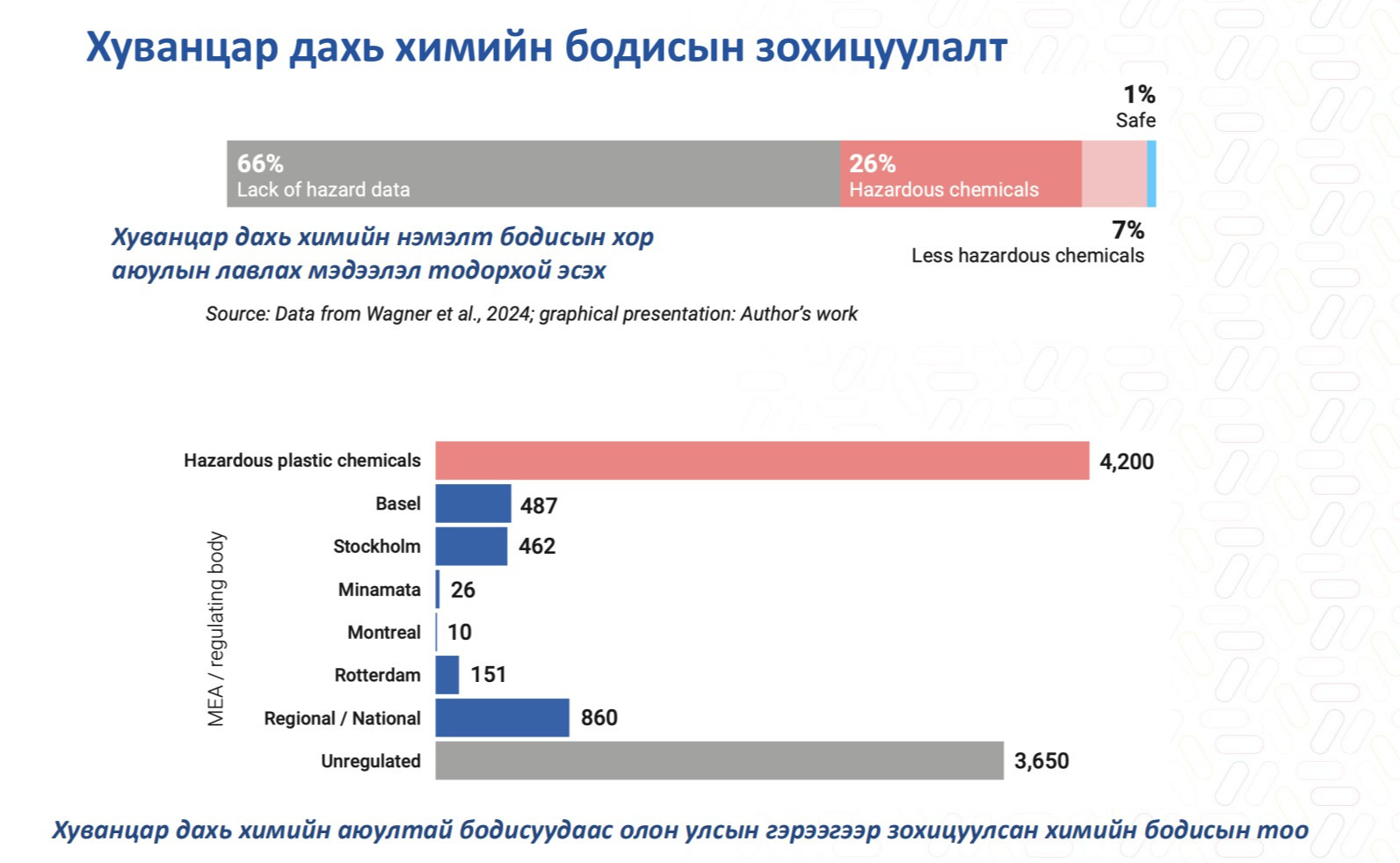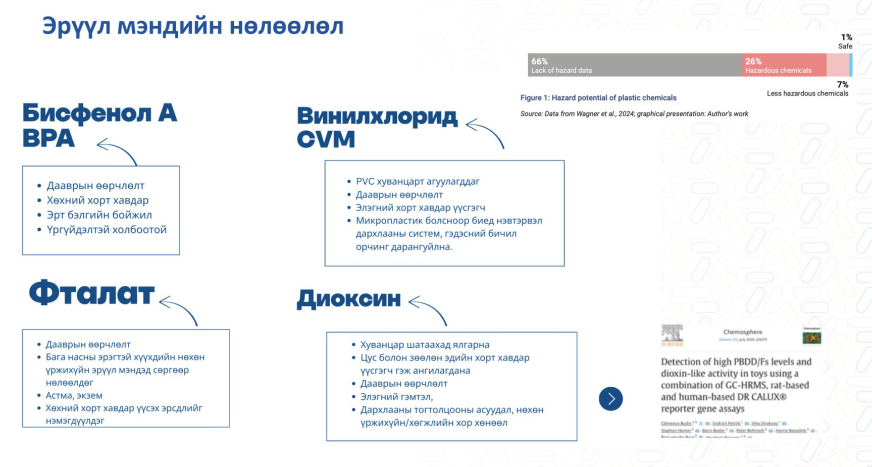 Одоогоор долоон төрлийн хуванцар байдаг аж. Эдгээрээс дахин боловсруулагддаг хуванцрыг РЕТ буюу хүнсний зориулалттай хуванцар гэж нэрлээд байгаа юм. 1970 онд ПЭТ савлагаа хийх үлээж сунгаж хэвлэх технологи бий болсон байна. Хуванцарт хүний эрүүл мэндэд хортой химийн бүтээгдэхүүн орсон байдаг. Хорт хавдар үүсгэдэг, дотоод шүүрлийн булчирхай үйл ажиллагаанд муугаар нөлөөлдөг болохыг тогтоосон. 99 хувийг нь газрын тос буюу шатах тослох материал болох байгалийн хийнээс гаргаж авдаг. Газрын тосыг олборлох, үйлдвэрлэх үе шат бүрд химийн бодис хэрэглэж эхэлдэг. Энэ утгаараа хүүхдийн тоглоомоос эхлүүлээд бүхий л эд хэрэглэлд химийн бодис орсоор байдаг. Дэлхийд нэгдсэн зохицуулалт байхгүйгээс хэн дуртай нь ямар нэгэн бүтээгдэхүүн үйлдвэрлэж юу ч хамаагүй хольж үйлдвэрлэж байна. Энэ нь хэрэглэгчийн эрхийг хамгаалах бодлого, хууль эрх зүйн орчин муутай холбоотой. Тэгвэл энэ бүгдийг олон улсын хуванцрын гэрээгээр зохицуулах боломжтой. Ингэснээр хуванцарт ордог полимер гэх мэт аюултай анхаарал татсан химийн бодисуудыг бүтээгдэхүүнээс бүрэн таних, ашиглалтаас гаргах, мөшгөх ил тод стандартыг бий болгох юм. Үйлдвэрлэгч энэ мэдээллээр хангахгүй бол зах зээлд нийлүүлэхгүй байх зарчмыг мөрдөнө гэсэн үг. Түүнчлэн нэн шаардлагагүй төвөгтэй, асуудал дагуулдаг бүтээгдэхүүн материалыг халах шаардлагатай. Харин дахин боловсруулах боломжтой РЕТ хуванцрыг дахин үйлдвэрлэхгүйгээр дахин ашиглах шийдэл одоогоор хамгийн зөв шийдэл гэдгийг олон улс хүлээн зөвшөөрсөн гэж доктор,дэд профессор Ц. Сонинхишиг илтгэлдээ хэлсэн.