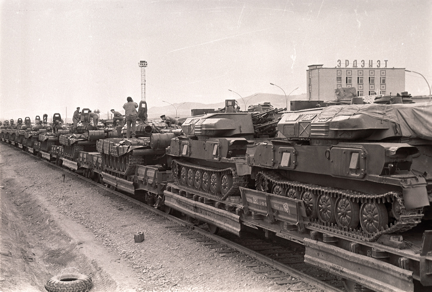 Зөвлөлтийн цэргийн ангиуудыг Монголоос гаргах үйл явц 1990-1992 онд болсон. Танкийн томоохон анги зэвсэг техникээ ачаад гарч байгаа үеийн энэ зургийг Эрдэнэтэд авсан.