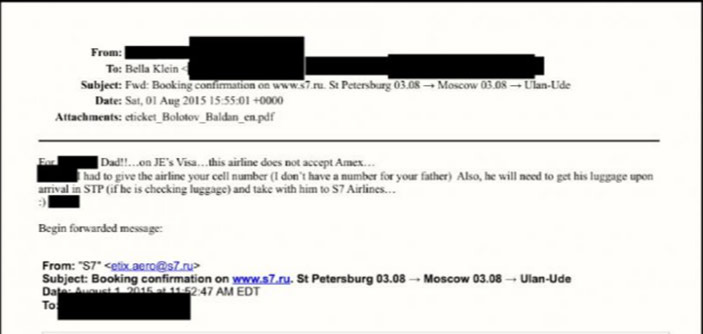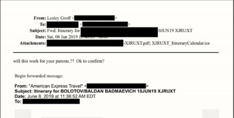 Эпштейнийн баруун гар, хувийн туслах Лесли Грофф хоёрын захидал харилцааг олон тооны бичиг баримт илрүүлжээ. Балдан Болотов гэдэг зорчигчид онгоцны тийз яаралтай худалдаж авах тухай яриа өрнөсөн байв. 2015 оны наймдугаар сарын 1-ний өдрийн захидалдаа Грофф хөрөнгийн эх үүсвэрийг зааж өгсөн "JE Visa карт руу ... энэ агаарын тээврийн компани Amex-ийг хүлээн авахгүй". JE бол Жеффри Эпштейн юм. Түүний хувийн Visa картаар Москва-Улан-Үд чиглэлийн S7-115 нислэгийн төлбөрийг хийжээ. Саятны туслахууд S7 Airlines компанийн Оросын захиалгын систем гүйлгээг хаасантай тулгарсан. Агаарын тээврийн компанийн хамгаалалтын алба Буриад руу явах тийзний төлбөрийг Америкийн санхүүчийн картаар хийсэн нь сэжигтэй гэж үзэж, карт эзэмшигчийн паспортыг сканнердахыг шаардсан байна.