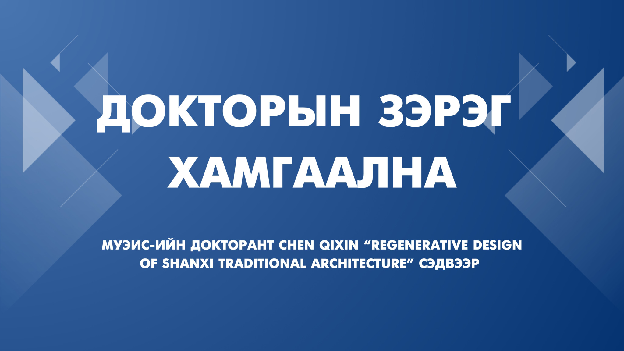 МУЭИС-ийн докторант Chen Qixin “Regenerative Design of Shanxi Traditional Architecture” сэдвээр доктор (Ph.D)-ын зэрэг хамгаална. Хамгаалуулах дэд зөвлөлийн хурал 2026 оны 03-р сарын 12-ны өдрийн 14:00 цагт Эрдмийн ордны 1501 тоот өрөөнд болно.