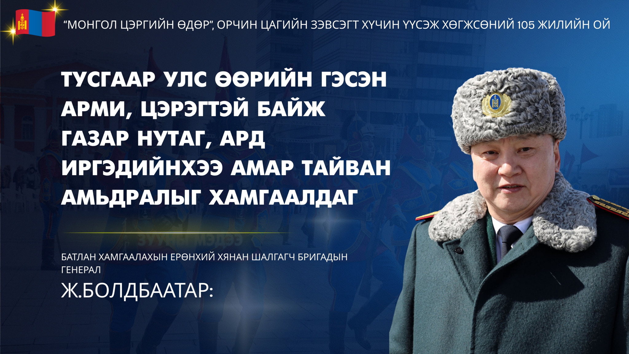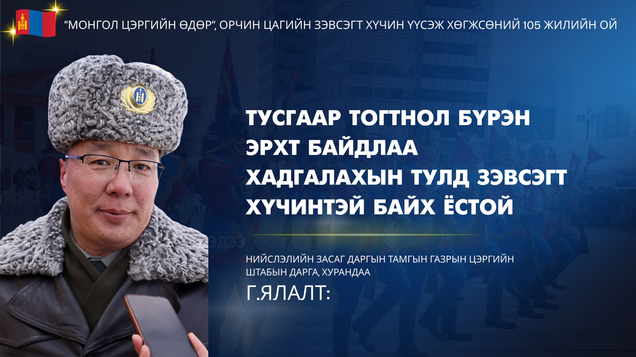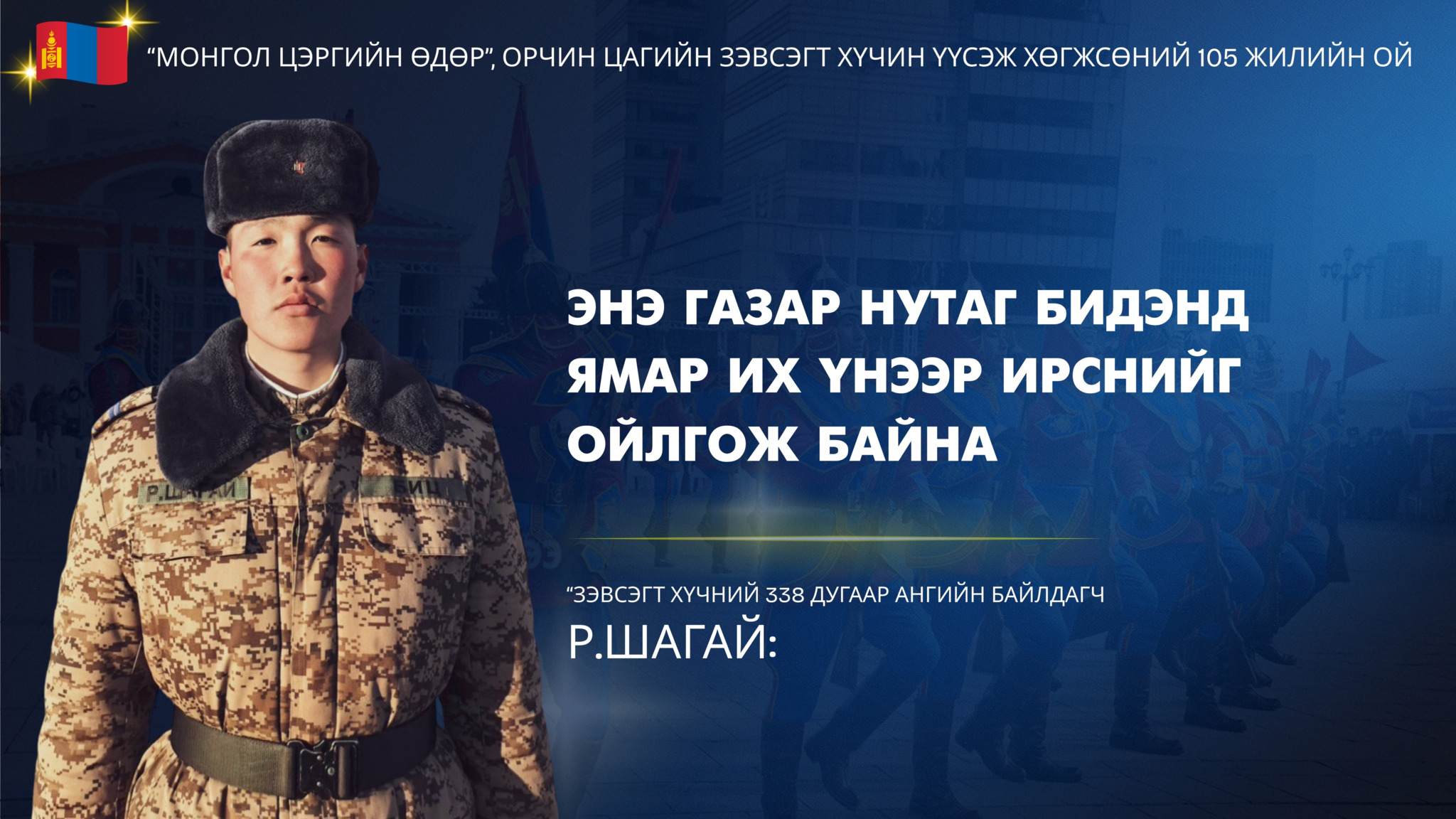 -1921 оны гуравдугаар сарын 18-ны өдөр “Шивээ Хиагт”-ыг эзэлж туурга тусгаар Монгол Улсаа зарлан тунхагласны 105 жилийн ой тохиож байна. Аз жаргалтай он жилүүдэд хүмүүс амьдралын хатуу хэцүү үе дайны хүнд бэрхийг амархан мартдаг гэдэг.Тиймээс болзошгүй цагт хэзээд эх орноо хамгаалахад бэлэн байх цэрэг эрстэй байгаа нь Монгол Улс дэлхийн бөөрөнд энхжин тогтнож, мөнхжин оршиж, үеийн үе дамнан Монгол Улсын аюулгүй байдал тусгаар тогтнол баталгаатай байгаагийн илэрхийлэл юм. Цэрэгтэй эх орон өөрөө цэнэгтэй буу шиг бэлэн байх нь хувь тавилангийн эх гэж бодож баярлаж, бахархаж, бас батлан хамгаалж зүтгэж яваа гэж боддог.