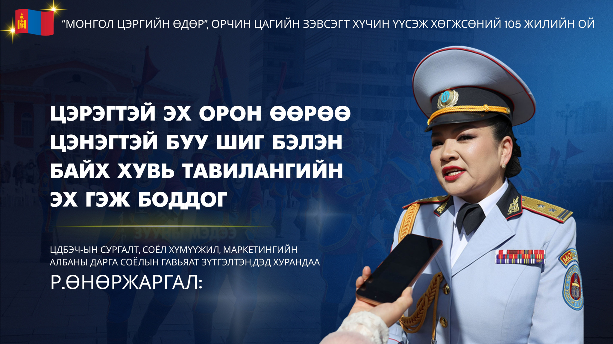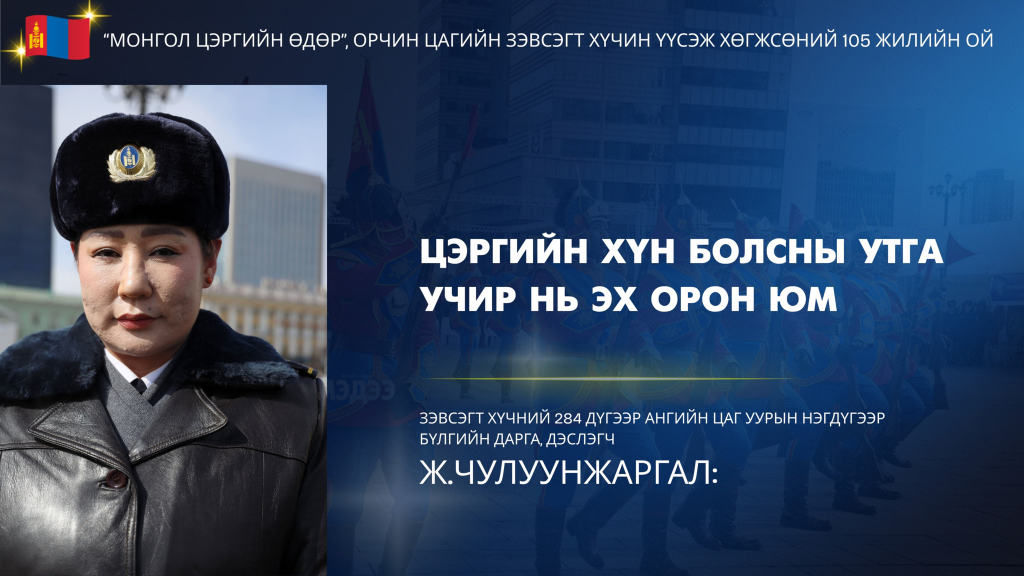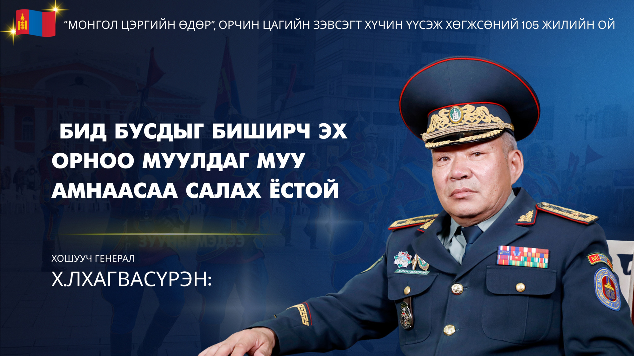 -Орчин цагийн Зэвсэгт хүчин үүсэж хөгжсөний 105 жилийн ой, Монгол цэргийн өдрийн мэндийг Батлан хамгаалах салбар, Зэвсэгт хүчин болон төрийн цэргийн байгууллагуудад ажиллаж байгаа бүх хүнд, үе үеийн цэргийн алба хаагчдадаа, эх орныхоо төлөө итгэл дүүрэн зогсох ирээдүй үеийн залуустаа “Зууны мэдээ” сониноор дамжуулан хүргэж байна. Эх орноо батлан хамгаалах эрхэм үүрэг хариуцлагыг үүрч яваа хүмүүсээр бахархахгүй байхын аргагүй. Амар тайван, итгэл дүүрэн амьдралын минь төлөө зогсож байгаа халуун эх орончид бол тэд юм. Тусгаар тогтносон улсын хувьд Монгол Улс зэвсэгт хүчинтэй байх нь зайлшгүй. Улс орны тусгаар тогтнол, бүрэн эрхт байдал, газар нутаг, улсын хилийн бүрэн бүтэн байдал, үндэсний аюулгүй байдлын төлөө Батлан хамгаалах салбар, Зэвсэгт хүчин маань зогсож байдаг. Түүнчлэн Монгол Улс өөрийн аюулгүй байдлыг хангах төдийгүй дэлхийн энх тайвны төлөө НҮБ-ын энхийг сахиулах үйл ажиллагаанд оролцож байна. Энэ хувь нэмрээрээ дэлхийд танигдаж, эх орныхоо төлөө, өөрийн мэдлэг боловсрол, зүрх сэтгэлээ дайчлан, өргөсөн тангарагтаа үнэнч байж, улсынхаа нүүр царай, нэр төрийг олон улсад өндөрт өргөж яваа “Монгол цэрэг”-үүдээрээ бахархдаг. Монгол Улсад анхны таван яам байгуулагдсаны нэг нь Цэргийн явдлын яам гэж байсан. Тэр үед улс орноо эмхлэх, эрх чөлөө, тусгаар тогтнол,бүрэн эрхт байдлаа хангах том зорилт ирэхэд энэ яам зайлшгүй хэрэгтэй байсан. Төрт улсын тусгаар тогтнолын баталгаа нь цэргийн хүч байсаар ирсний нэг илрэл нь энэ юм.