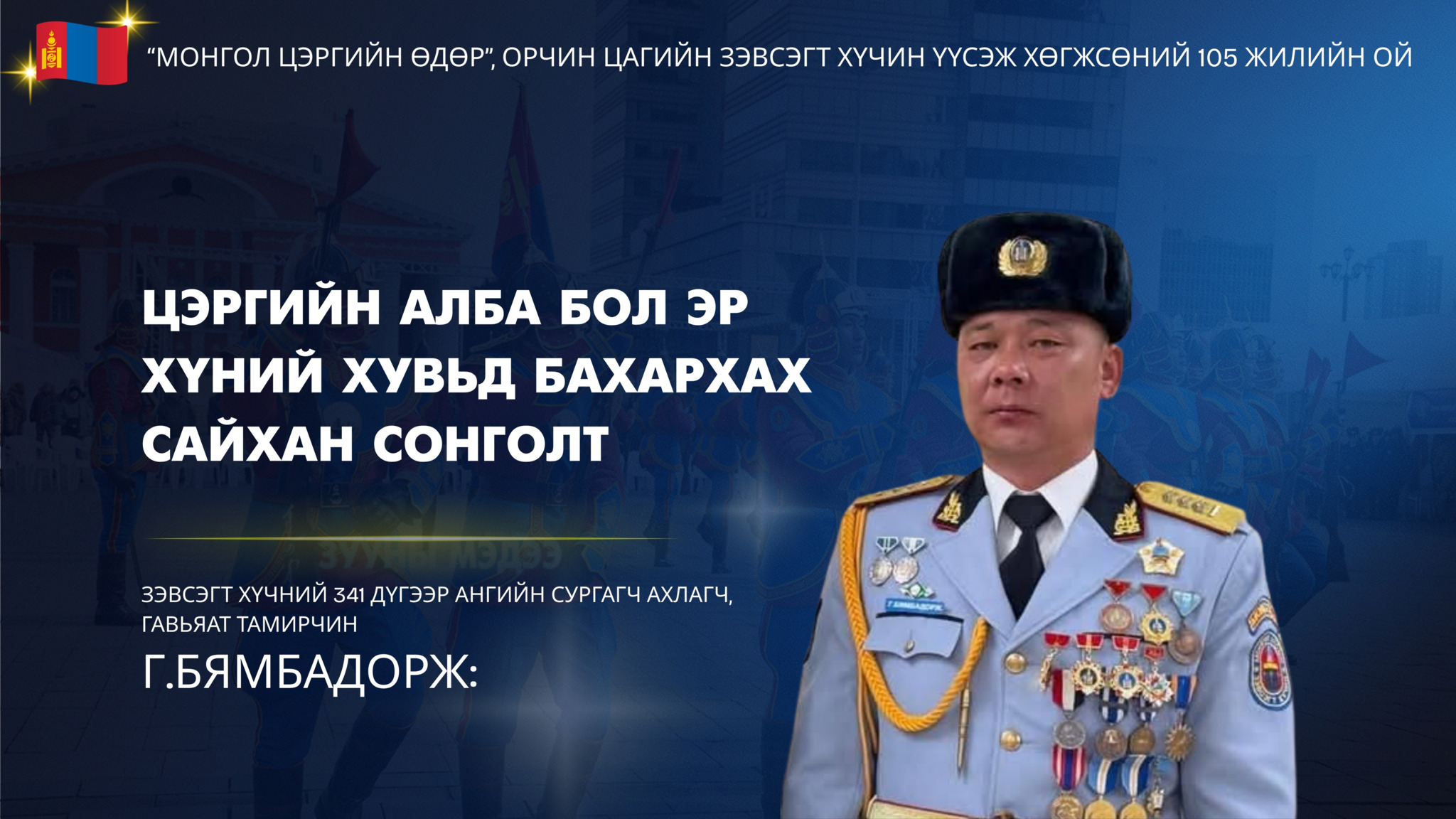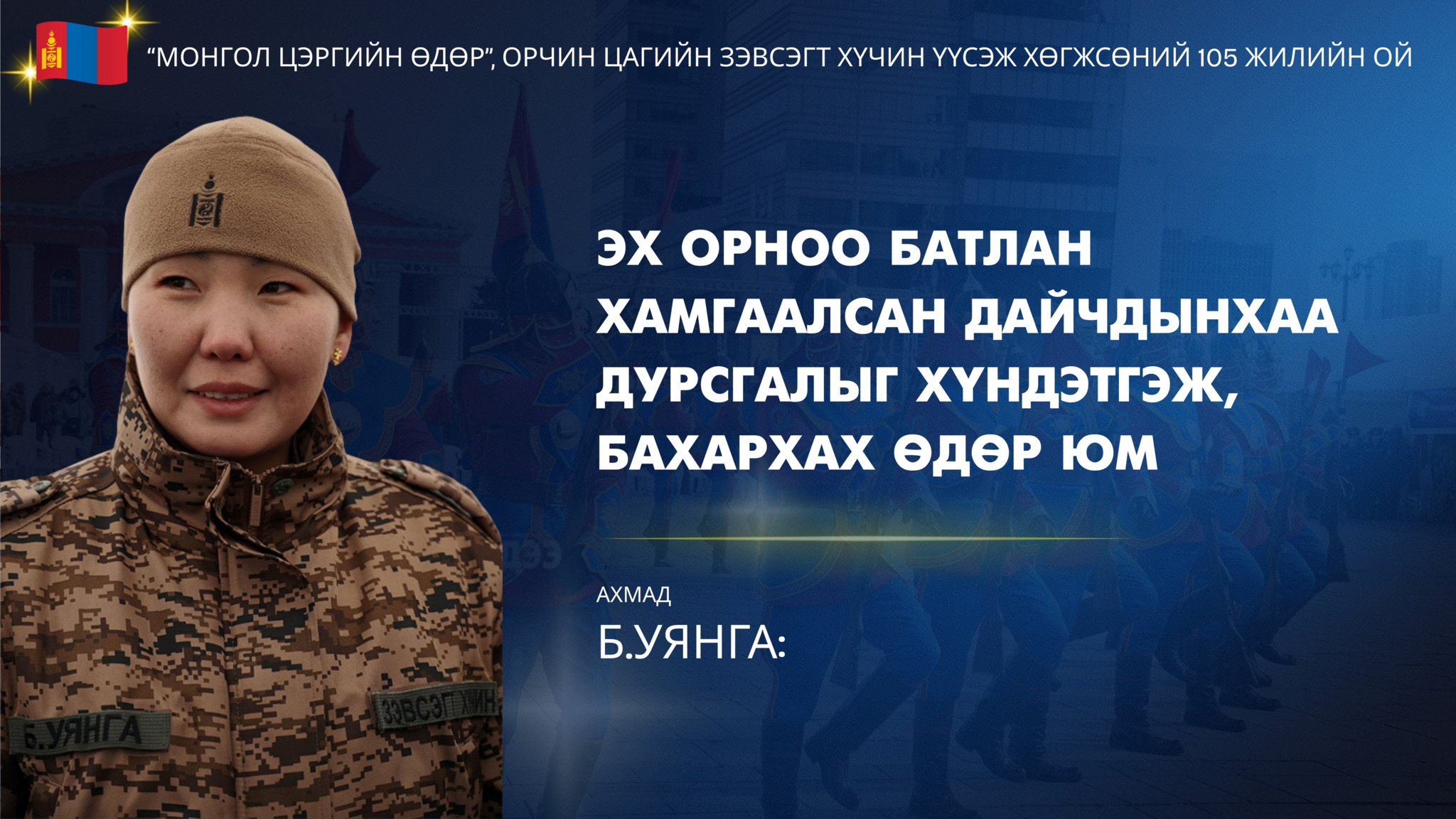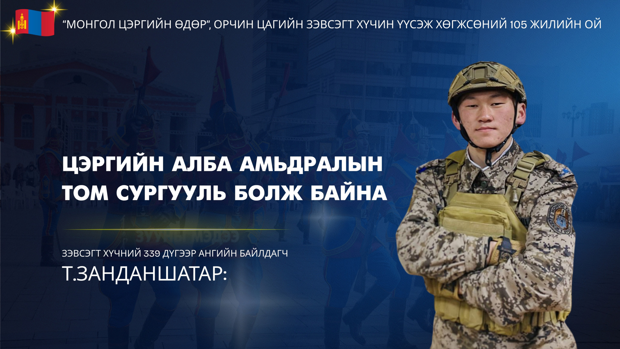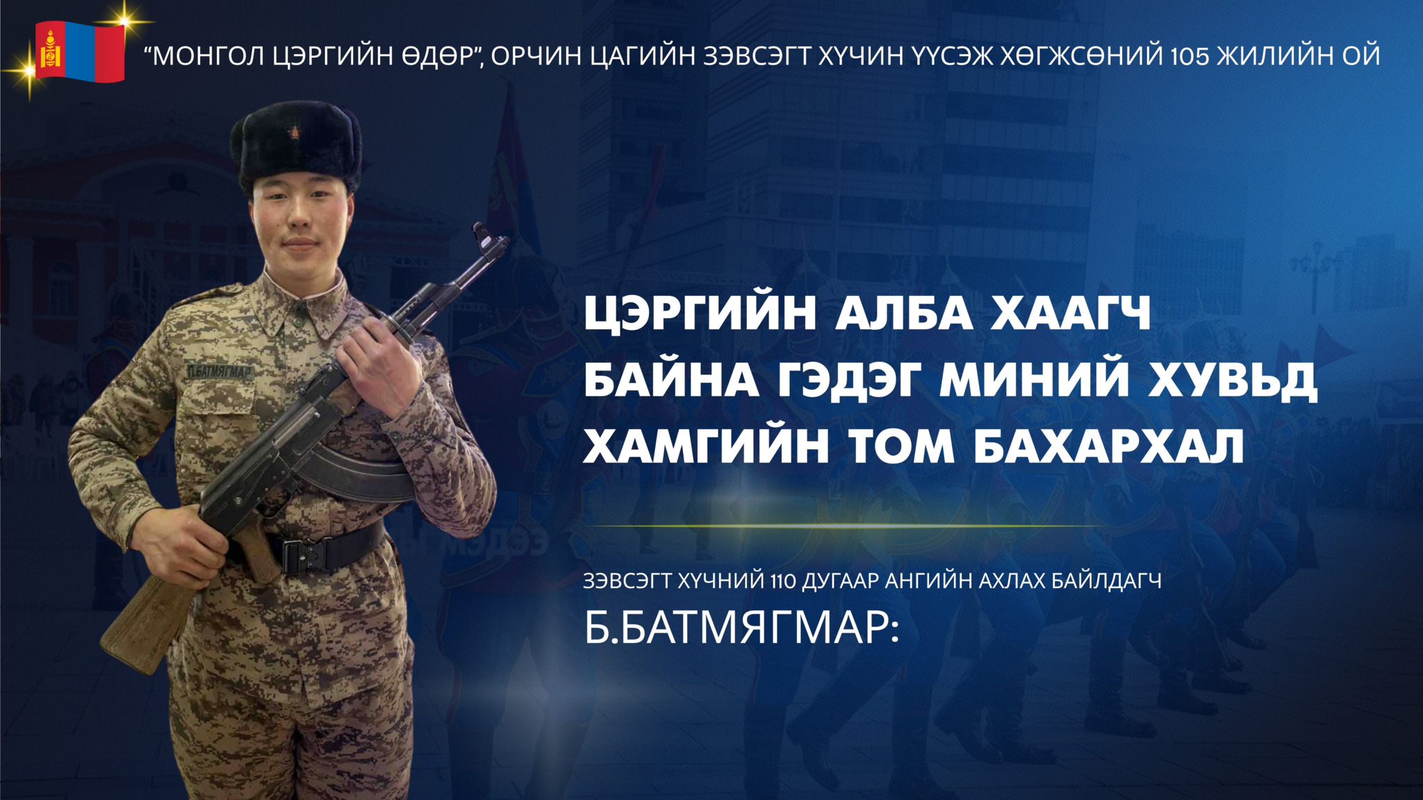 -Миний бие 2025 оны хоёрдугаар ээлжээр Хөвсгөл аймгийн Цагаан-Уул сумаас хошууч генерал Д.Бавуу агсны нэрэмжит Цэргийн гавьяаны одонт Зэвсэгт хүчний 110 дугаар ангид татагдан ирж албаа нэр төртэй хааж байна. Энэ түүхэн өдөр Монгол Улсын Зэвсэгт хүчний 105 жилийн ойн баярын мэндийг нийт ахлагч, офицер, цэргийн алба хаагчдадаа өргөн дэвшүүлье. Цэргийн алба хаагч байна гэдэг миний хувьд хамгийн том бахархал. Эх орныхоо тусгаар тогтнол, аюулгүй байдлыг сахин хамгаалах ариун үүргийг нэр төртэй биелүүлж яваа цэргийн алба хаагч байна гэдэг миний хувьд хамгийн том бахархал юм. Энэ өгүүлбэрээр асуултад хариулсан гэж бодож байна. Би хугацаат цэргийн албыг хааж байх хугацаандаа сахилга бат, хамтын ажиллагаа, бие бялдрын болон сэтгэл зүйн тэсвэр хатуужлыг сурч, өөрийгөө олон талаар хөгжүүлж байна.