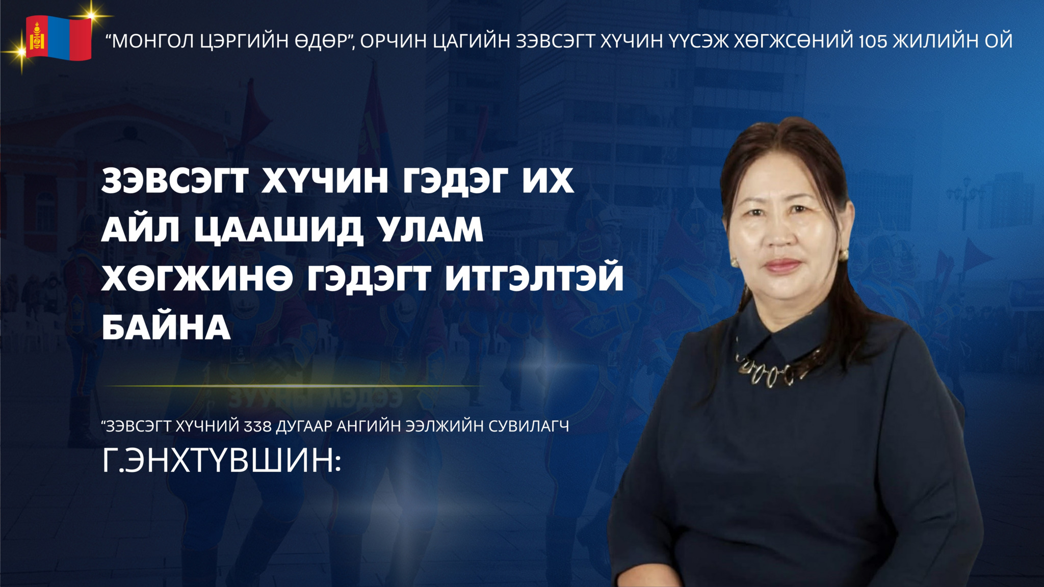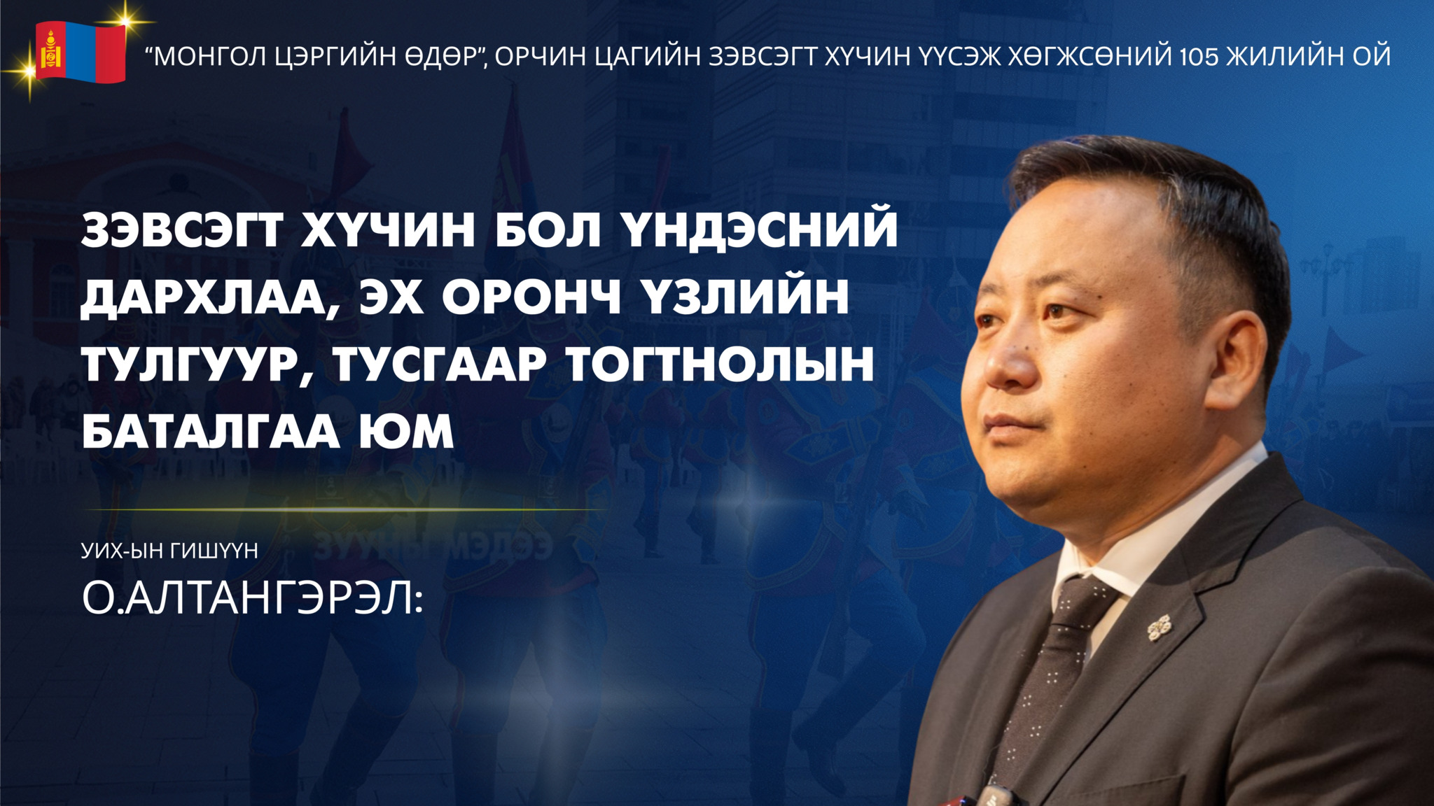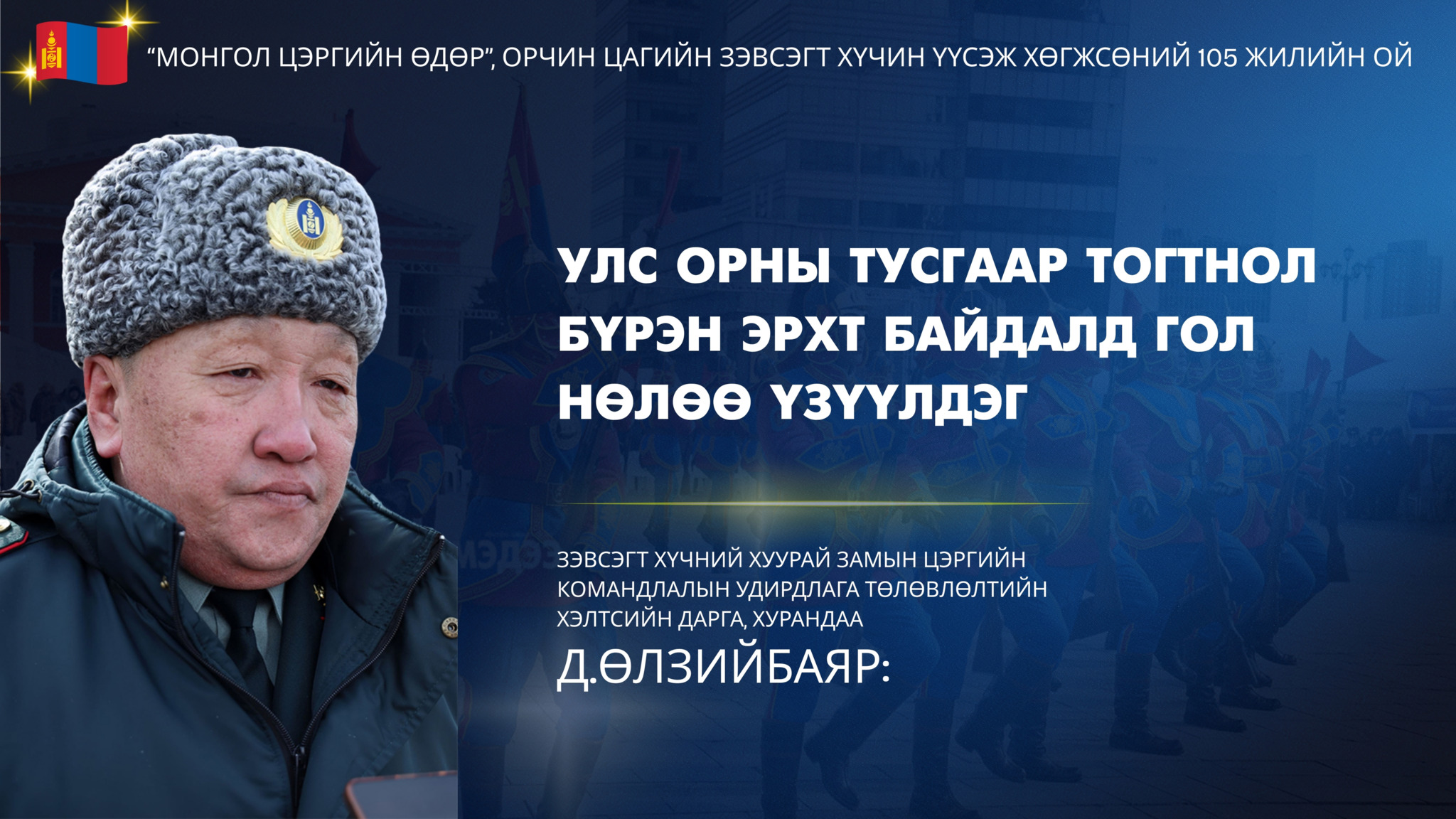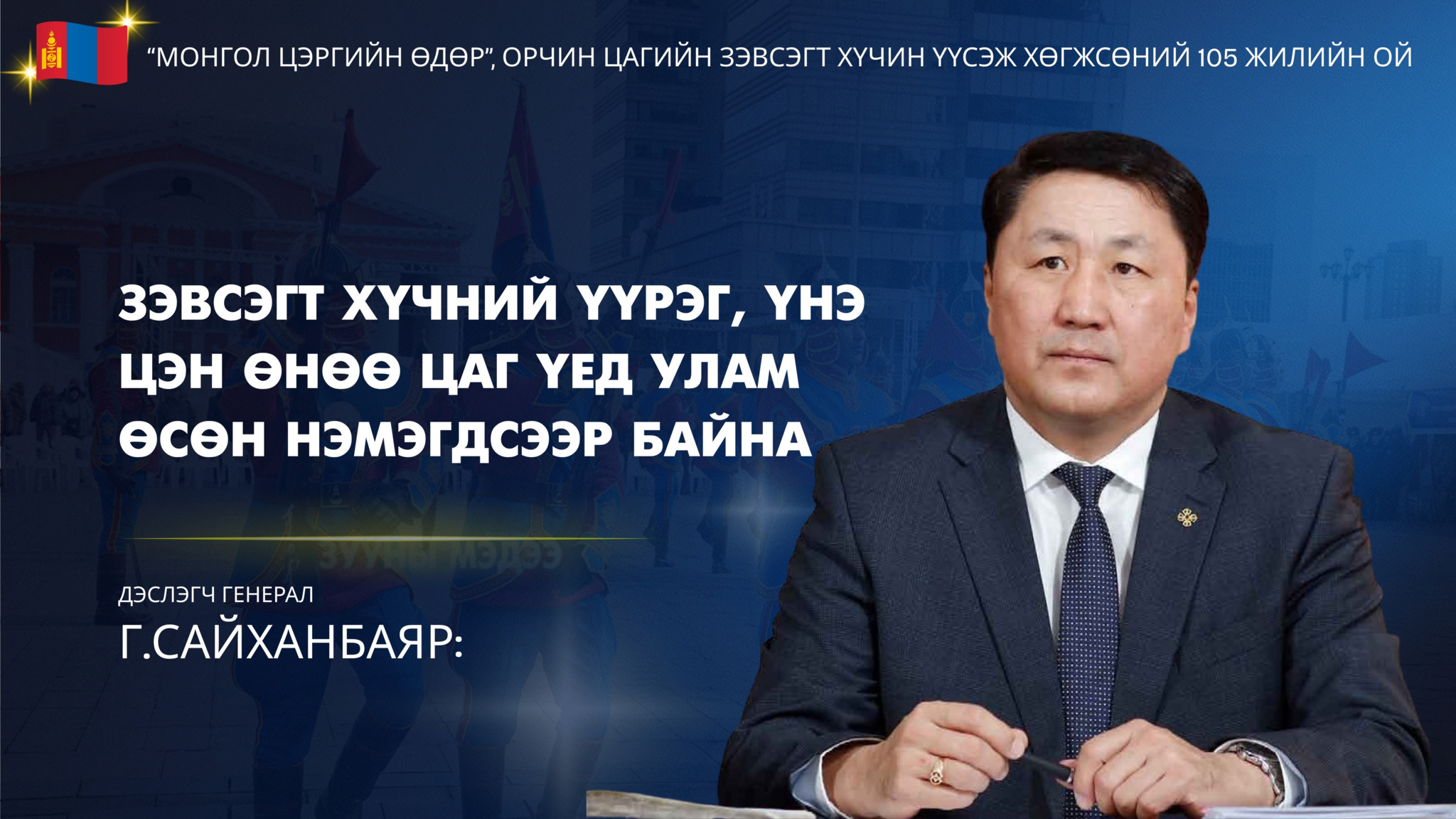 -Орчин цагийн Зэвсэгт хүчний 105 жилийн ой бол зөвхөн тоон үзүүлэлт бус, Монгол цэргийн хэдэн мянган жилийн түүхэн уламжлалын үргэлжлэл юм. Энэ бол эх орон, газар шороо, тусгаар тогтнолоо хамгаалж ирсэн монгол хүний сэтгэлгээ, зориг, үнэт зүйлийн илэрхийлэл билээ. Ердөө 40 жилийн өмнө бид эх орноо гадны аливаа аюул заналаас өөрсдийн хүчээр хамгаална, хэний ч өмнө сөхөрч буухгүй гэсэн итгэл үнэмшилтэй ард түмэн байсан. Харин өнөөдөр эсрэгээрээ энэ үзэл санааг сул дорой болгох ойлголт нийгэмд шургалах болсонд эмзэглэж явдаг. Үнэн хэрэгтээ тусгаар улс оршин тогтнохын гол баталгаа нь өөрийгөө хамгаалах чадвар, өөрийн зэвсэгт хүчин юм. Өнөөгийн дэлхий дахины нөхцөл байдал үүнийг тодхон харуулж байна. Хүчний харьцаа тэнцвэргүй ч эх орныхоо төлөө тууштай тэмцэж буй улс орнууд, байгалийн баялаг, геополитикийн ашиг сонирхлоос үүдэн мөргөлдөөнд өртөж буйн олон жишээ бидэнд нэгийг сануулж байгааг хэлье. Тусгаар тогтнол гэдэг зүгээр нэг тунхаг биш, харин хамгаалж байх ёстой үнэт зүйл. Монгол Улс бол газар нутагтай, баялагтай, тусгаар тогтносон улс. Тиймээс түүнийг хамгаалах үүрэг, хариуцлага бид бүхэнд бий. Шаардлагатай цагт эх орноо хамгаалахад бэлэн байх нь монгол хүн бүрийн, ялангуяа эр хүний нэр төрийн хэрэг. Иймээс Зэвсэгт хүчин бол зүгээр нэг байгууллага биш энэ бол үндэсний дархлаа, эх оронч үзлийн гол тулгуур, тусгаар тогтнолын баталгаа юм.