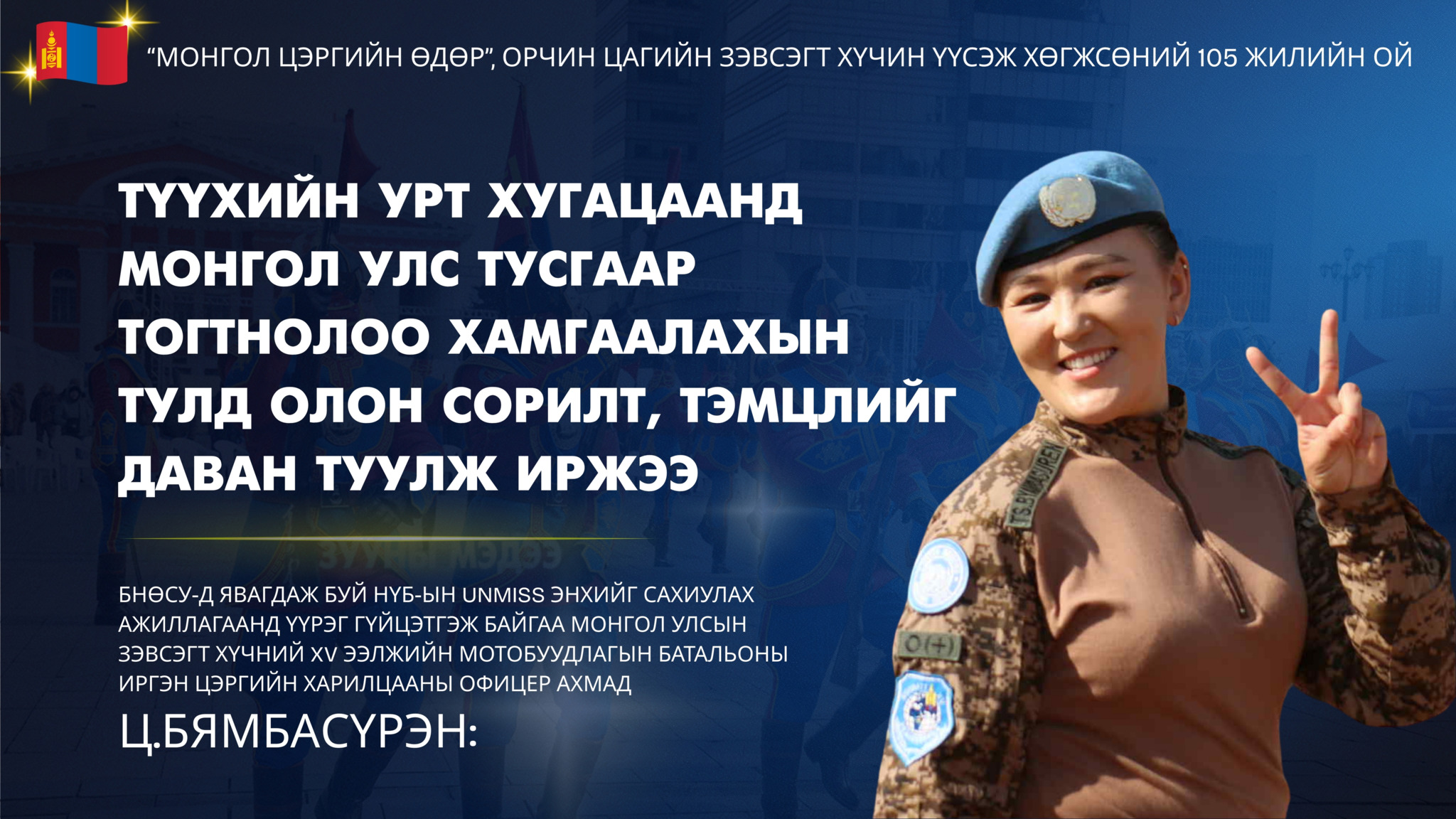 БНӨСУ-д явагдаж буй НҮБ-ын UNMISS энхийг сахиулах ажиллагаанд үүрэг гүйцэтгэж байгаа Монгол Улсын Зэвсэгт хүчний XV ээлжийн мотобуудлагын батальоны Иргэн цэргийн харилцааны офицер ахмад Ц.Бямбасүрэн: Түүхийн урт хугацаанд Монгол Улс тусгаар тогтнолоо хамгаалахын тулд олон сорилт, тэмцлийг даван туулж иржээ
