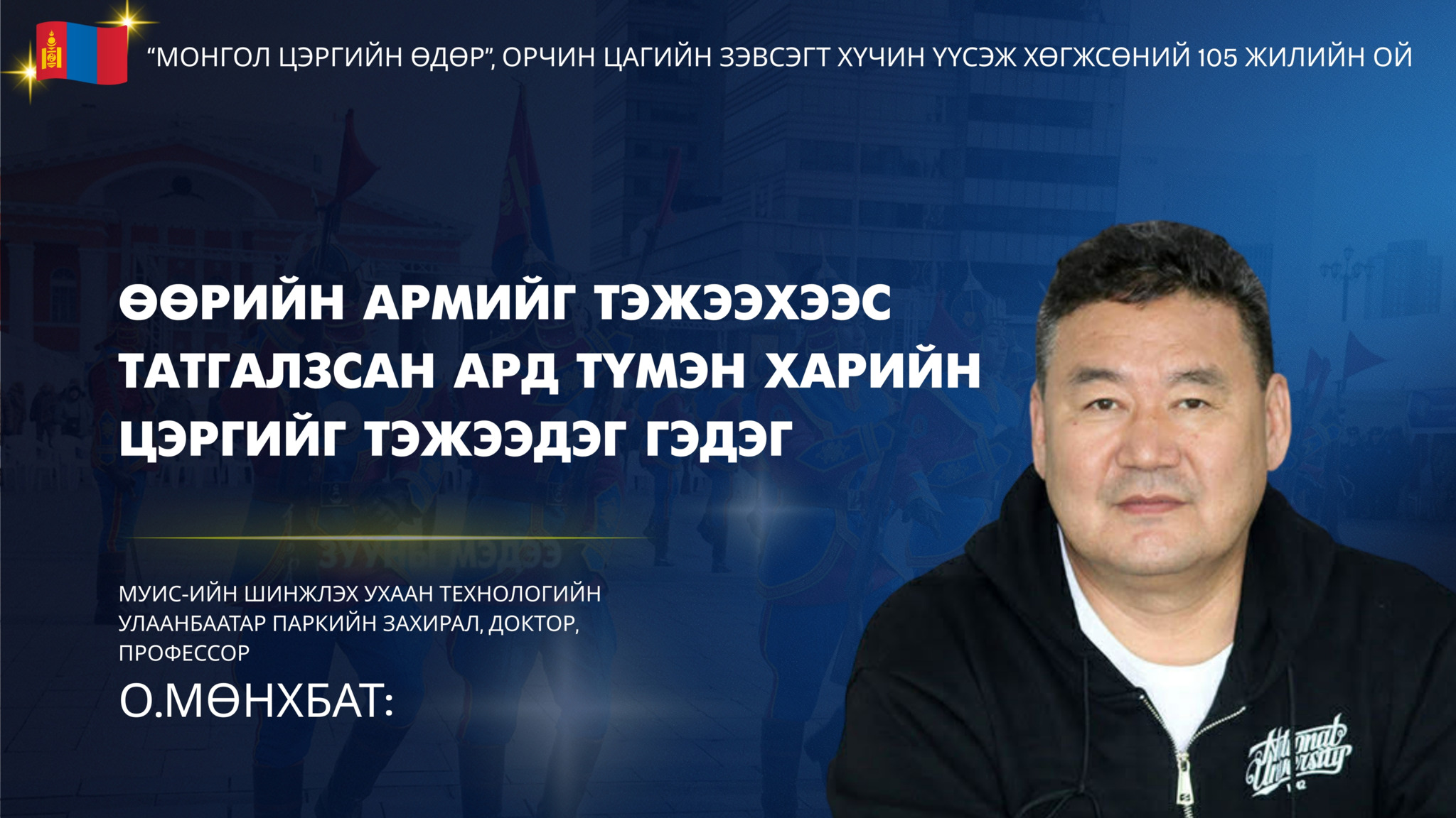 -Монгол Улсад орчин цагийн Зэвсэгт хүчин үүсэн байгуулагдсаны 105 жилийн ойн баярын мэндийг нийт цэргийн алба хаагчид, ахмад дайчид болон эх орныхоо аюулгүй байдал, тусгаар тогтнолын төлөө хүчин зүтгэж буй нийт хүмүүст хүргэе.