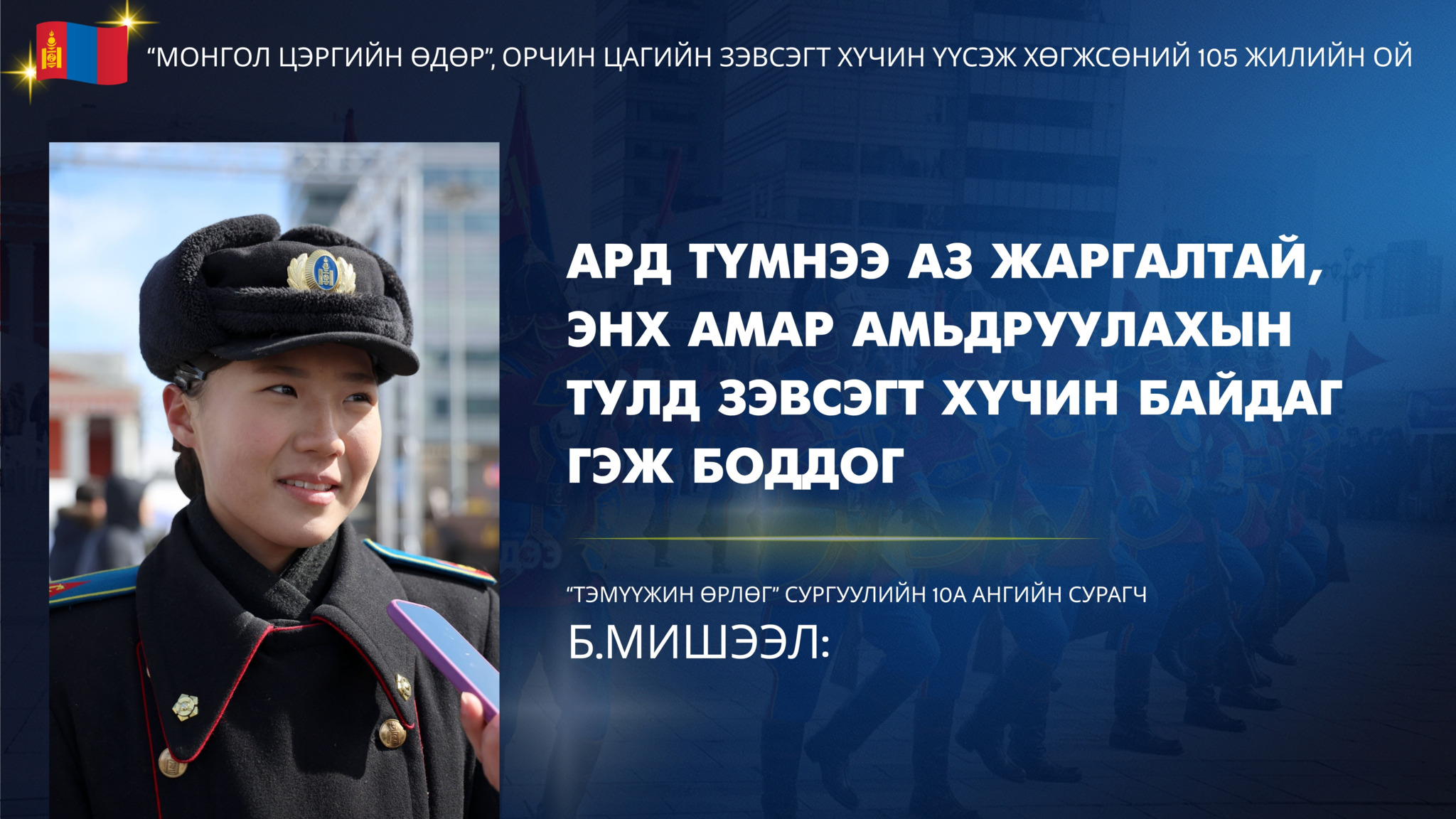 “Тэмүүжин өрлөг” сургуулийн 10а ангийн сурагч Б.Мишээл: Ард түмнээ аз жаргалтай, энх амар амьдруулахын тулд зэвсэгт хүчин байдаг гэж боддог