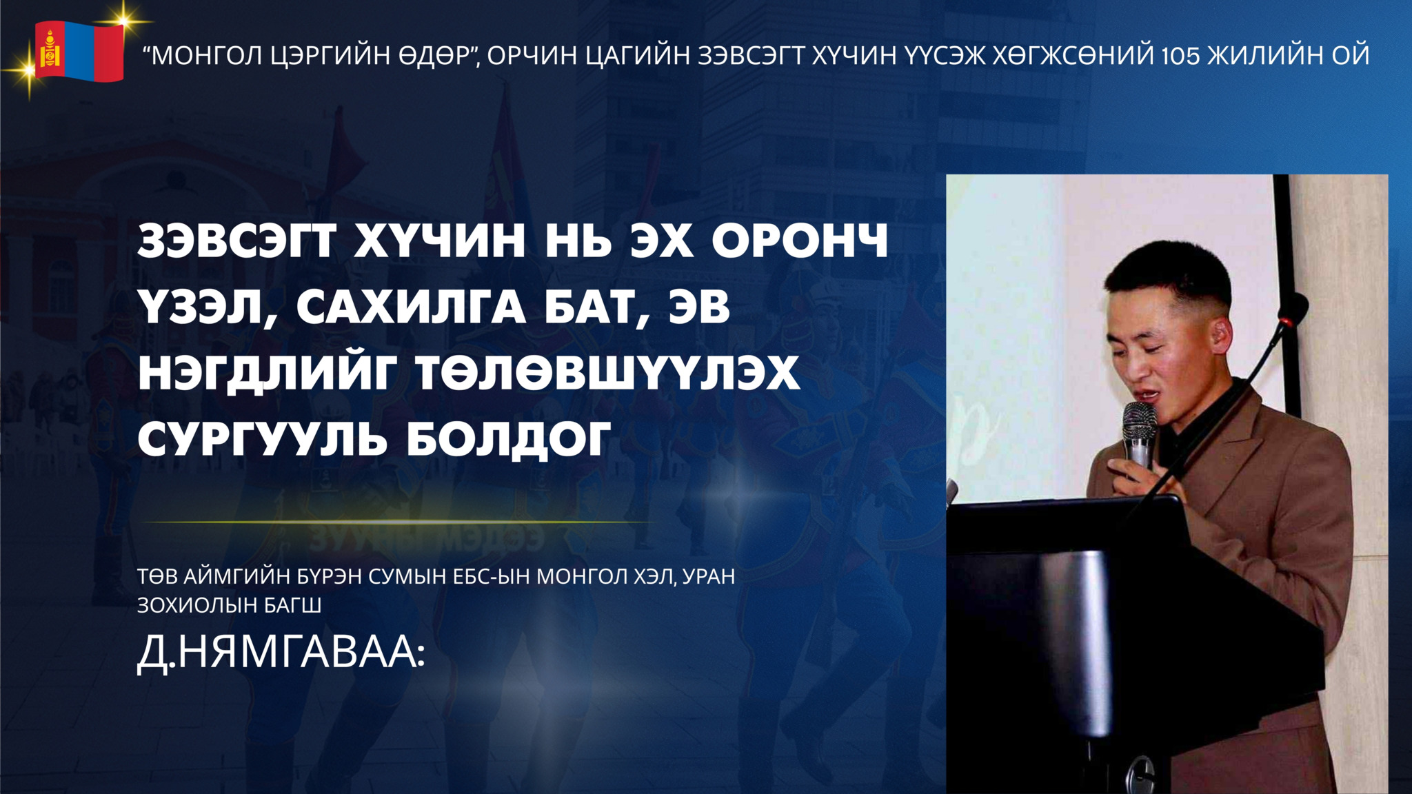Төв аймгийн Бүрэн сумын ЕБС-ын монгол хэл, уран зохиолын багш Д.Нямгаваа: Зэвсэгт хүчин нь эх оронч үзэл, сахилга бат, эв нэгдлийг төлөвшүүлэх сургууль болдог