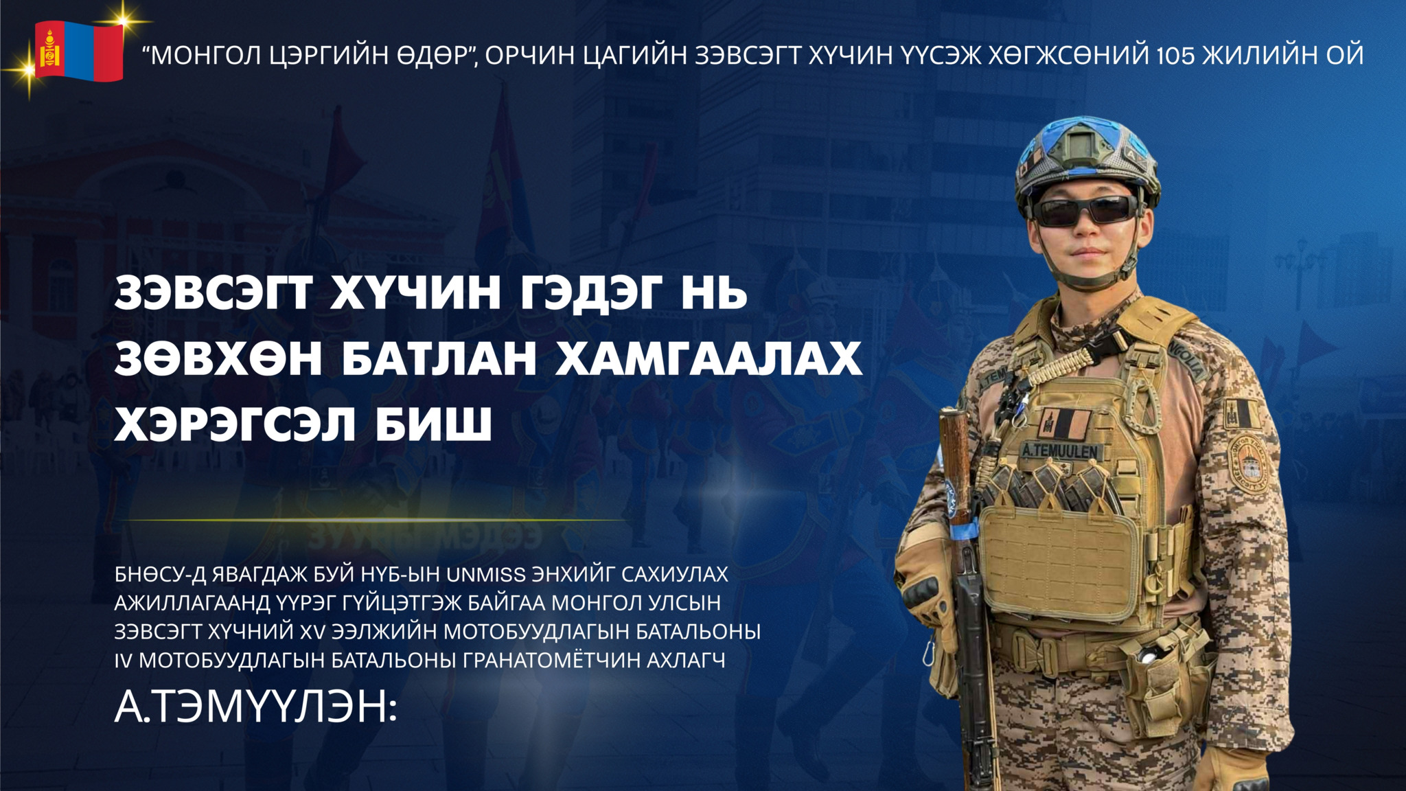 -Аливаа улс орон өөрийн гэсэн Зэвсэгт хүчинтэй байх ёстой. Зэвсэгт хүчин бол улсын тусгаар тогтнол, бүрэн эрхт байдлын баталгаа юм. Түүхийн урт хугацаанд Монгол Улс тусгаар тогтнолоо хамгаалахын тулд олон сорилт, тэмцлийг даван туулж ирсэн. Энэ утгаараа өөрийн армитай байна гэдэг нь гадаад аюул заналхийллээс урьдчилан сэргийлэх, улс орны аюулгүй байдлыг хангах гол тулгуур багана болдог. Одоогийн манай Зэвсэгт хүчин хүүхэд багачууд, залуучууддаа эх оронч үзэл, сахилга бат, хариуцлага, эв нэгдлийг төлөвшүүлэх том сургууль болдог гэж би боддог. Залуу үе цэргийн алба хааснаар зөвхөн бие бялдрын хувьд төдийгүй сэтгэл зүй, ухамсрын хувьд төлөвшиж, эх орноо хайрлах, хамгаалах үзэлтэй болно. Орчин үед Монгол Улсын Зэвсэгт хүчин олон улсын энхийг сахиулах ажиллагаанд идэвхтэй оролцож, дэлхийн энх тайвны төлөө хувь нэмрээ оруулж байгаагийн нэг жишээ бол НҮБ-ын мандатттай UNMISS энхийг сахиулах ажиллагаа юмаа. Энэ нь Монгол Улсын нэр хүндийг олон улсад өсгөхөөс гадна цэргийн албан хаагчдын ур чадвар, туршлагыг харуулж байгаа юм. Би ч бас энхийг сахиулагчидтайгаа мөр зэрэгцэн дэлхийн халуун цэгт үүрэг гүйцэтгэж байгаадаа баяртай байна. Эцэст нь хэлэхэд, Зэвсэгт хүчинтэй байна гэдэг нь зөвхөн батлан хамгаалах хэрэгсэл биш, харин улсын аюулгүй байдал, тусгаар тогтнол, нийгмийн тогтвортой байдал, ирээдүйн хөгжлийн баталгаа юм. Иймээс Монгол Улс Зэвсэгт хүчнээ орчин үеийн шаардлагад нийцүүлэн хөгжүүлж, хүний нөөц, техник технологийн чадавхыг нь байнга сайжруулж байх нь туйлын чухал гэж бодож байна.