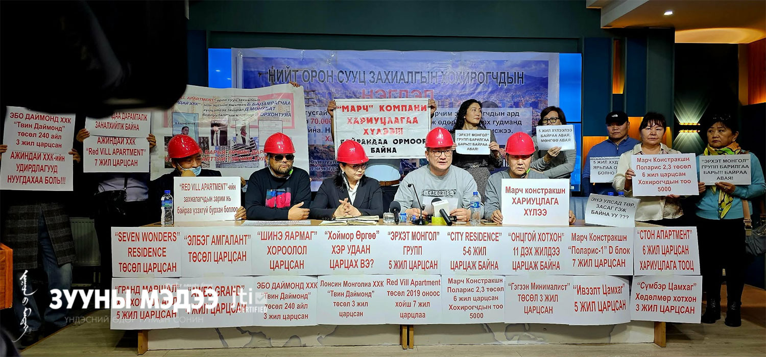“Марч констракшн” барилгын компанийн хохирогч “Марч констракшн” нь 2016 онд “Polaris-1” гэх дөрвөн блок бүхий барилгын төслийг эхлүүлсэн. Одоогоор гурван блок нь ашиглалтад орсон ч нэг блок барилга нь ашиглалтад оролгүй царцсан хэвээр байна. Мөн 2018 онд “Polaris-2” буюу таван блок барилгын төслийг эхлүүлсэн. Үүнээс хоёр блок нь ашиглалтад орж, гурван блок барилга царцсан байгаа. Харин 2020 онд “Polaris-3” дөрвөн блок барилгыг эхлүүлсэн ч одоог хүртэл ашиглалтад ороогүй байгаа. 2016 -2026 оныг хүртэл 10 жилийн хугацаанд 13 блок барилга барихаас таван блок барилгыг барьж, ашиглалтад оруулсан байдаг. Гэтэл цаана нь найман блок барилгад нийт 800 орчим захиалагч буюу 5000 орчим иргэн цаг хугацаа, мөнгө санхүү, сэтгэл санаа гээд олон зүйлээр хохироод байна” гэлээ.