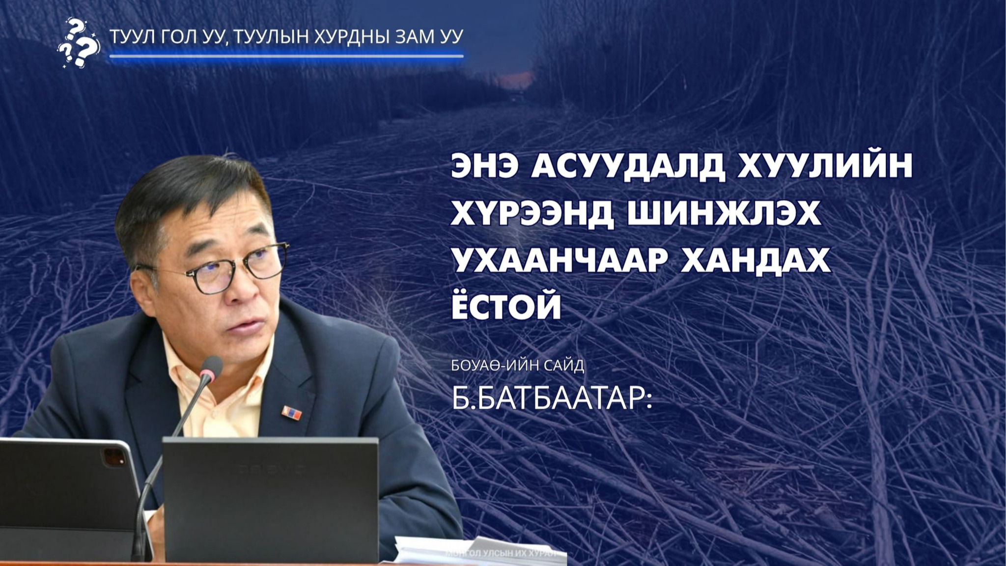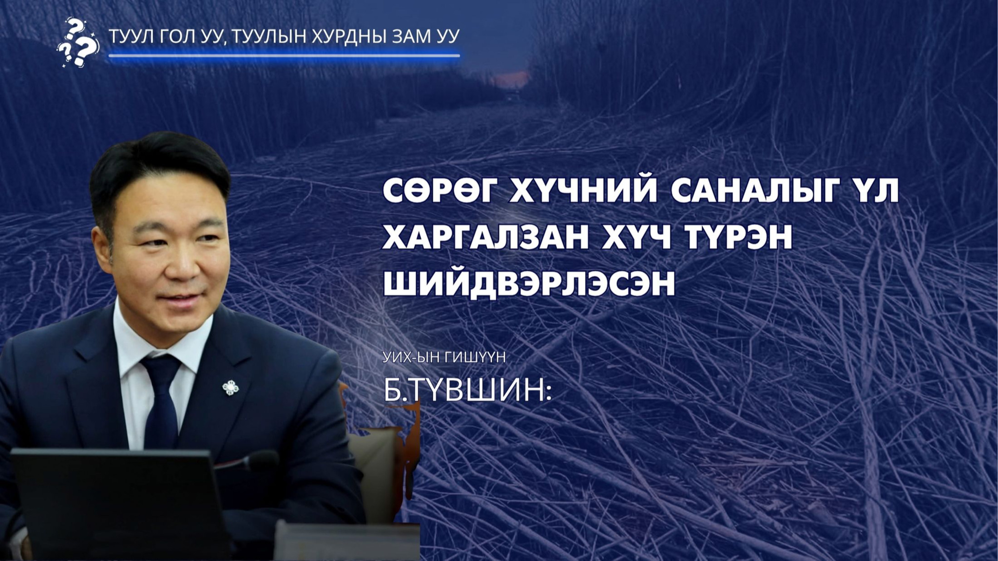 -БОУАӨ-ийн сайдын хувьд Туулын хурдны замтай холбоотой асуудал дээр хоёр зүйлийг голлон анхаарч байгаа. Нэгдүгээрт, хуулиас давсан ямар нэг үйлдэл, тушаал шийдвэр гарсан байх ёсгүй. Хоёрдугаарт, шинжлэх ухаанчаар хандах ёстой. Мэргэжлийн боловсон хүчин, эрдэмтэд, судалгааны байгууллагууд болон албан хаагчдын гаргаж байгаа дүгнэлтээр асуудалд хандах ёстой. Энэ хүрээндээ Усны газар болон харьяа газрууд, эрдэмтэн судлаачдыг хамруулан хууль эрх зүйн хүрээнд нь дүгнэлт гаргаж Туулын хурдны замтай холбоотой асуудлуудад эцсийн байр суурийг илэрхийлэх нь зүйтэй гэх нөхцөлтэйгөөр ажиллаж байна. Түүнээс биш улс төрийн сэдлээр асуудалд хандаж, үг дуугарах нь буруу.