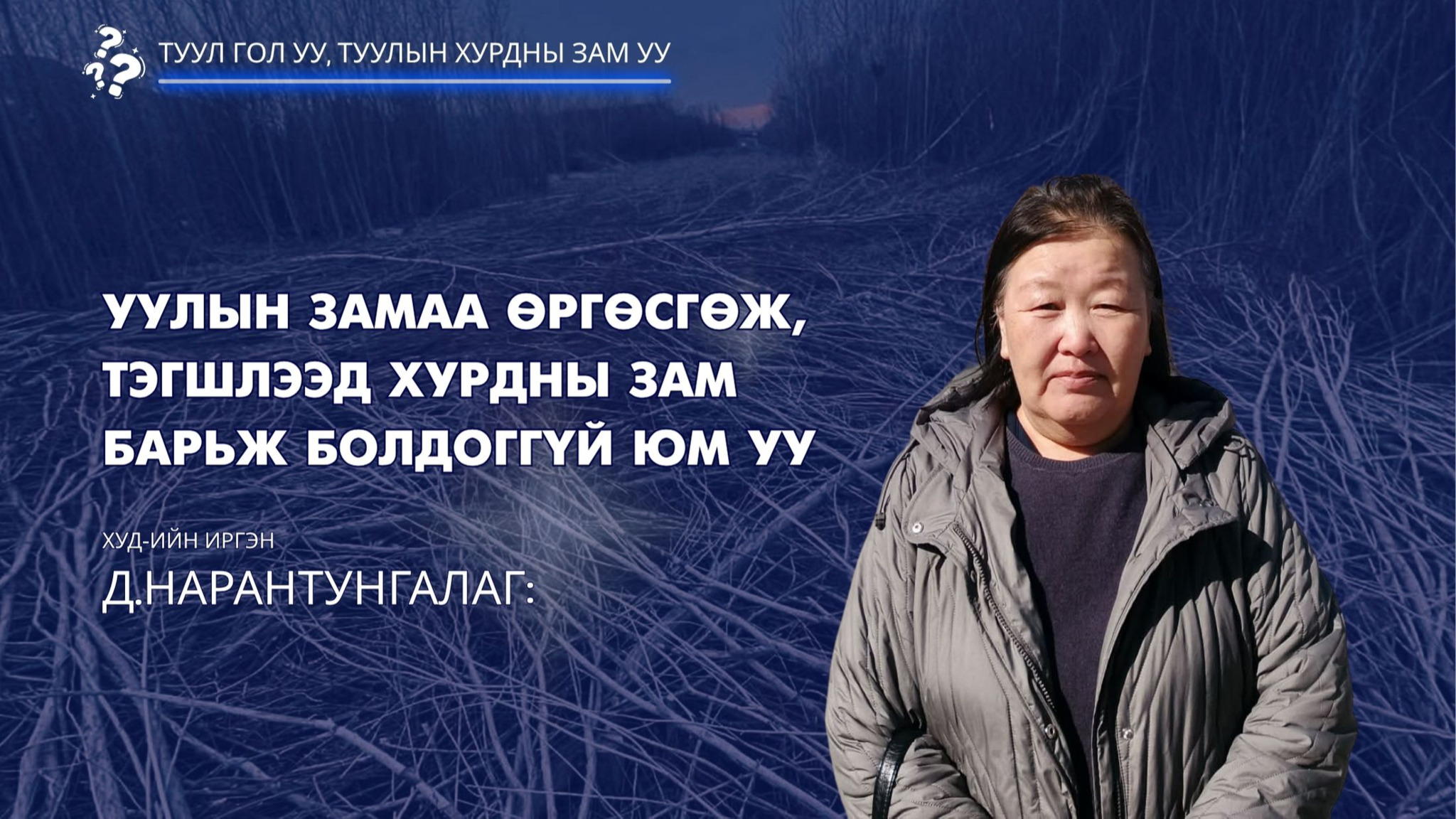 -Би ХУД-ийн “Мишээл Резидэнс” байранд амьдардаг.Тэнд хүмүүс очиж агаарладаг цэцэрлэг байдаг. Гэтэл яг тэр цэцэрлэгийн дээгүүр зам барихаар төлөвлөж байна. Туул голын усан дотор машин зогсоогоод нүх ухаж байгаа харагдсан. Миний зүрх сэтгэлийг өвтгөж байгаа зүйл нь хурдны зам барилаа гэхэд машины утааны хорт бодис гол руу орно. Өвөл халтиргаа гулгаа үүсэхээр зам дээр бодис цацдаг. Тэр бүгд ус руу орно шүү дээ. Автобус хүлээгээд хэдэн минут болоход бид утаанд нь яаж хорддог билээ. Гэтэл тэр машины утаа, хорт бодис Туул голыг бохирдуулна гэж яагаад бодохгүй байгаад эмзэглэж байна. Уулын замаа өргөсгөж, тэгшлээд яагаад хурдны замаа барьж болдоггүй юм бол. Өөр шийдэл олон байна шүү дээ. Туул гол минь гэж бодохоос гол харлаж байна.