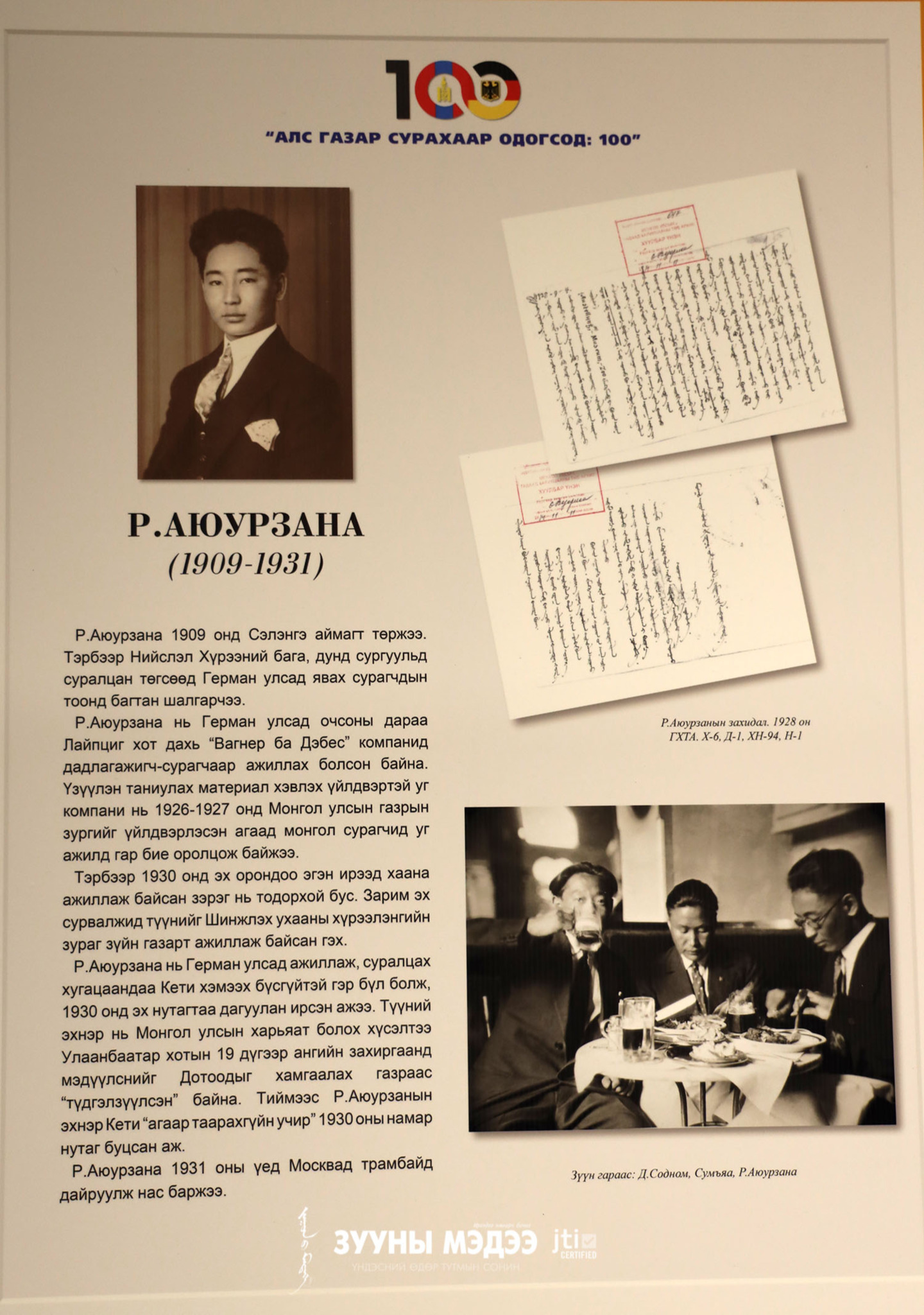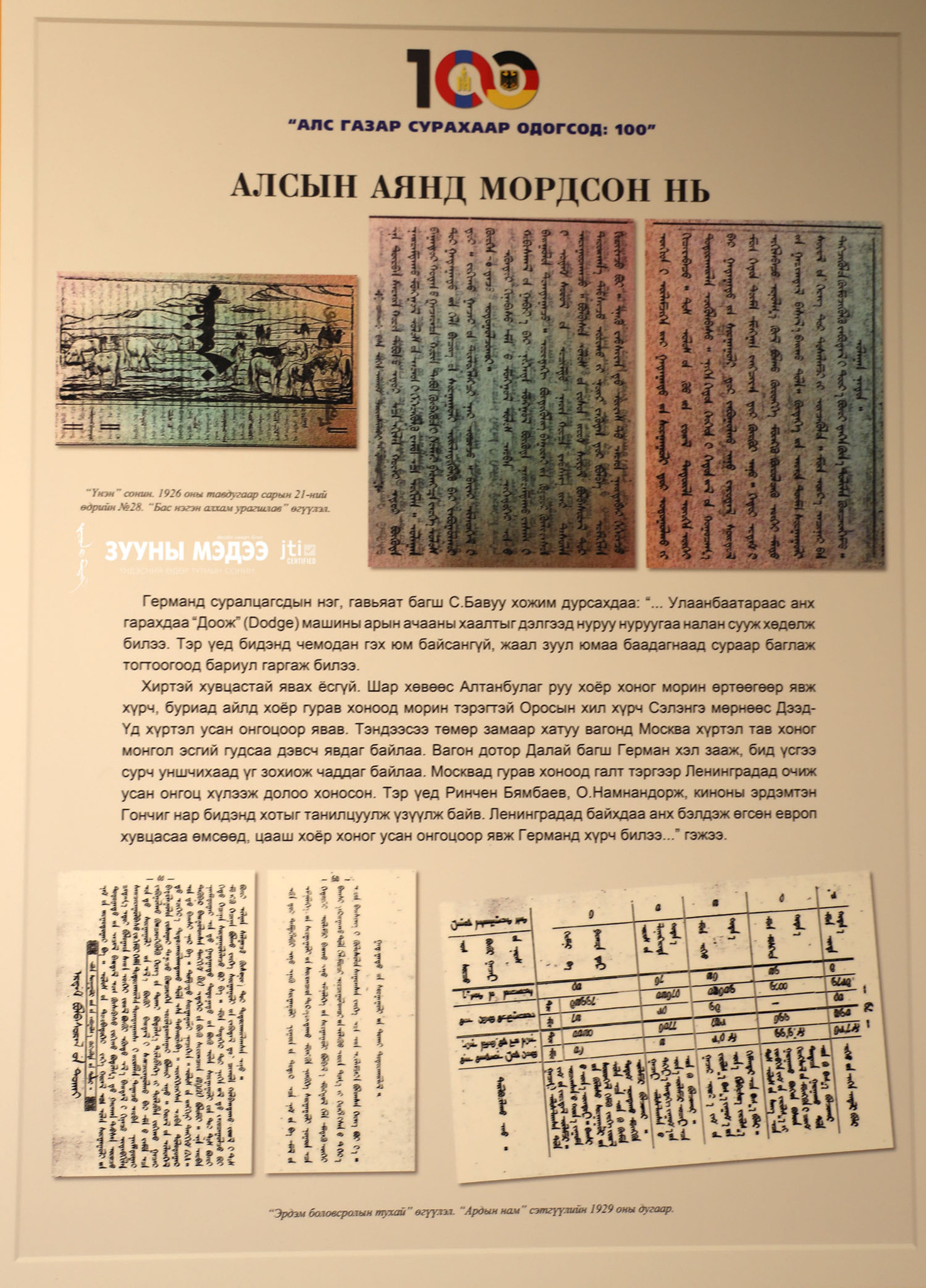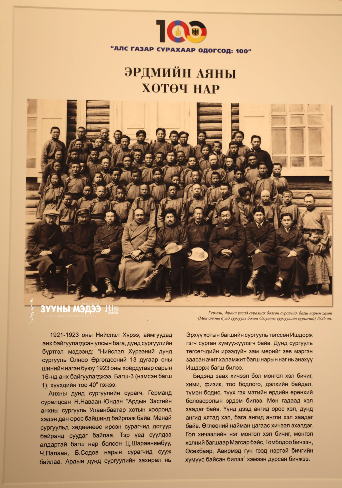 Монгол сурагч, оюутнууд Өрнөд Европт суралцаж эхэлсний 100 жилийн ой энэ онд тохиож байна. Цагаатгах ажлыг удирдан зохион байгуулах улсын комиссоос санаачлан төрийн бусад байгууллага, судлаачидтай хамтран "Алс газар сурахаар одогсод:100" үзэсгэлэнг Монголын үндэсний музейд зохион байгууллаа. Энэ тухай гэрэл зургийн сурвалжилгаас харна уу.