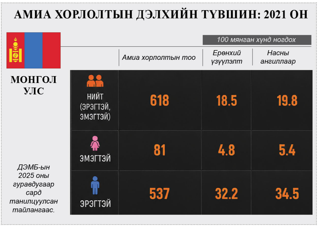 “ДЭМБ-ын судалгаагаар манай улс амиа хорлолтын тоогоор дэлхийд хоёрдугаарт бичигдэж байна” гэсэн мэдээлэл үе үе цахим орчинд нийтлэгддэг. Уншсан ямар ч хүн анхаарал татахаар энэхүү мэдээлэл бол ДЭМБ-аас хоёр жилийн өмнө гаргасан судалгаанаас онцлон гаргасан баримт юм. Яг үнэндээ бол дэлхийд хоёрдугаарт биш, манай улс 100 мянган хүн ам тутам дахь амиа хорлолтын 18-19 тохиолдол бүртгэгддэгээрээ Ази тивдээ хоёрдугаарт бичигдэж байгаа хэрэг. Гэхдээ Ази тивдээ, 100 мянган хүн ам тутамд юм гэж алгуурлаж боломгүй үнэхээр өндөр үзүүлэлт. Яагаад гэвэл дэлхийн дундаж 8-9 байдаг бол манайх энэ тооноос хоёр дахин их. Хэдийгээр дээрх мэдээлэл нь өнөөдөр дэлгэж байгаа цоо шинэ баримт биш боловч амиа хорлолт буурахгүй байгааг ЦЕГ-аас мөн анхааруулсаар байна.
