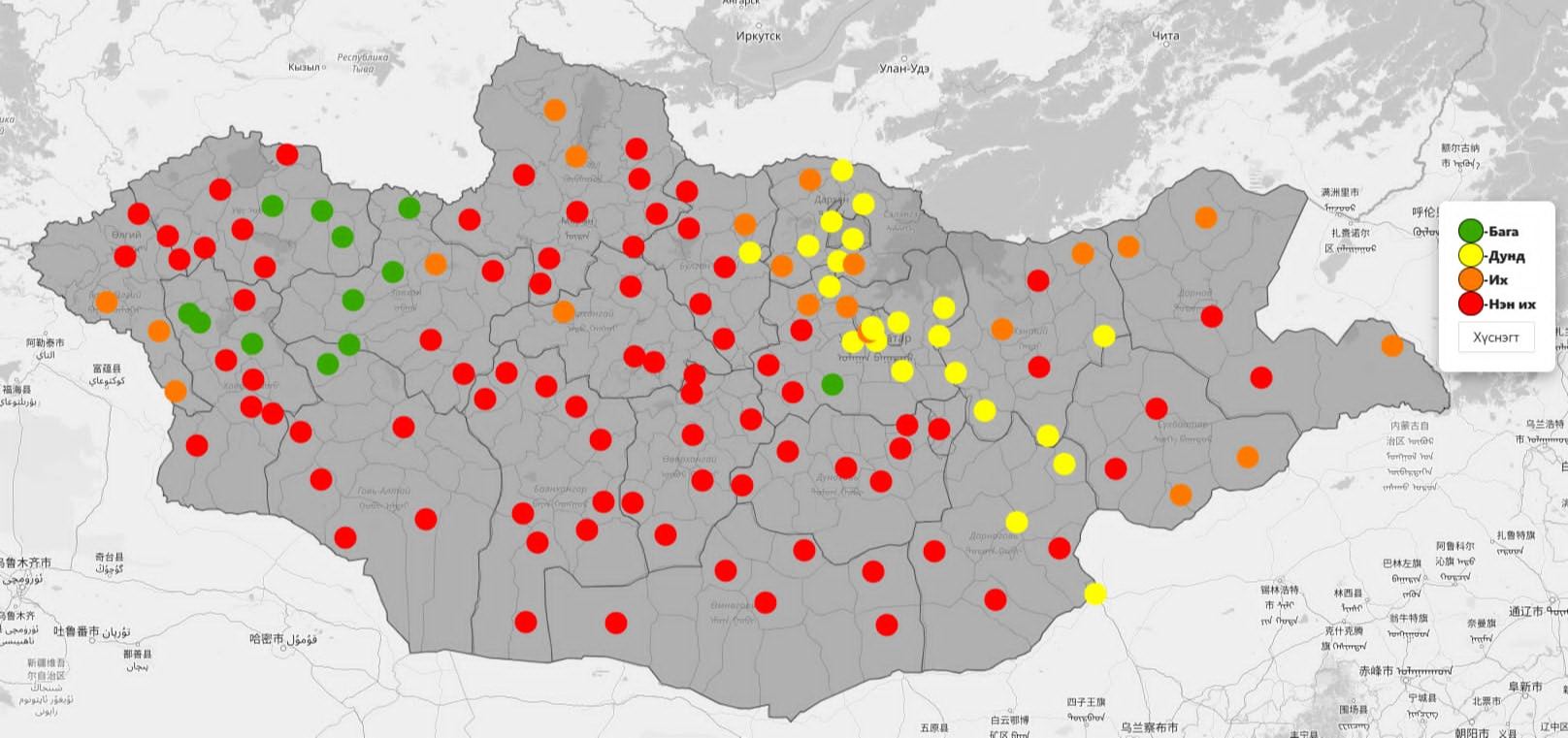 Цаг агаарын нөхцөл байдал дөрөвдүгээр сарын 29-ний байдлаар Говь-Алтай, Баянхонгор, Өвөрхангай, Өмнөговь, Дундговь, Говьсүмбэрийн нийт нутаг, Увс, Булганы баруун, Завханы зүүн, Хөвсгөл, Архангайн ихэнх нутаг, Баян-Өлгий, Сүхбаатарын хойд, Төв аймгийн баруун, Дорноговь, Дорнодын өмнөд хэсгээр хуурайшилт нэн их байна. Харин Баян-Өлгийн өмнөд, Булганы зүүн, Завхан, Хөвсгөлийн өмнөд, Хэнтий, Сэлэнгэ, Төв, Дорнодын зарим газраар хуурайшилт ихтэй байгаа аж. Харин Эрдэнэт, Дарханы нутаг, Сэлэнгэ, Төв аймгийн зүүн, Хэнтий, Дорноговийн зарим газраар хуурайшилтийн зэрэг дунд түвшинд байна. Иймд иргэд дор бүрнээ анхаарал болгоомжтой байж, гал түймрийн аюулаас сэргийлэхийг албаныхан сануулж байна. Мөн гал түймэр гарсан тохиолдолд чанга дуугаар хашгирч бусдад мэдэгдэх, боломжтой бол унтраах арга хэмжээ авах, 101 дугаарт яаралтай холбогдож дуудлага мэдээлэл өгөх хэрэгтэй юм. Түүнчлэн галд өртсөн тохиолдолд хэвтэж, өнхрөх, утаа ихэссэн үед сууж эсвэл мөлхөж гарцаар гаран өөрсдийн амь нас, эрүүл мэндийг хамгаалах боломжтой гэдгийг сануулъя.