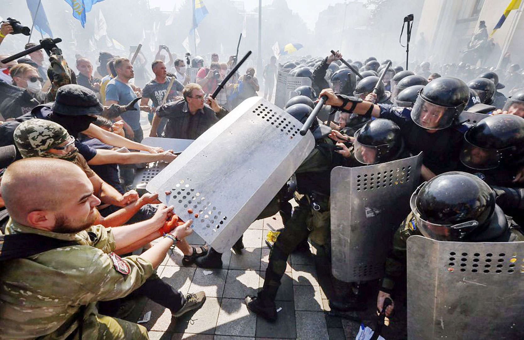 Украины нийслэл Киев хотын парламентын ордны өмнө болсон мөргөлдөөнд Үндэсний хамгаалалтын албаны гурав дахь ажилтан амиа алдсаныг Дотоод хэргийн сайд Арсен Аваков мэдэгдлээ. Зүүн хэсгийн Донецк, Луганскийн бүс нутагт илүү их эрх мэдэл, давуу тал олгох хуулийг анхны хэлэлцүүлгээр батлахыг эсэргүүцсэн хэдэн мянган үндсэрхэг үзэлтнүүд эсэргүүцлийн жагсаал хийсэн юм. Жагсаал цагдаа нарын эсрэг тэмцэл, тулаан болон хувирч хэт үндсэрхэг Свобода намын нэгэн идэвхтэн гар аргаар хийсэн тэсрэх бөмбөгийг цагдаа нар руу шидсэн аж. Улмаар эмх замбараагүй байдал үүсч жагсагчид, цагдаа нарын хооронд “дайн” дэгдсэн. Гурван цагдаа амиа алдаж, 100 гаруй хүн шархдаж гэмтжээ. Хэдэн арван хүний биеийн байдал тааруу байна. “Тэсрэх бөмбөгт өртөж шархдаад эмнэлэгт хүргэгдсэн бас нэг цагдаа амиа алдлаа” хэмээн А.Аваков Twitter хуудсаараа дамжуулан мэдээлэв. Шархадсан хүмүүсийн ихэнх нь цагдаа нар байгаа аж.