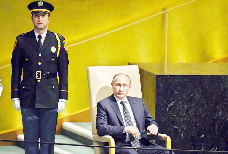ОХУ-ын Ерөнхийлөгч Владимир Путин НҮБ-ын индэр дээрээс үг хэлэхдээ, терроризмын эсрэг тэмцэх өргөн эвсэл байгуулахыг уриалахын зэрэгцээ Сирийн “хууль ёсны” Засгийн газрыг дэмжихийг олон улсын хамтын нийгэмлэгээс хүслээ. “Бид бүгдийн өмнө тулгарч байгаа бэрхшээлийг даван гарахын тулд бид хүчээ нэгтгэх хэрэгтэй байна” хэмээн арван жилийн дараа НҮБ-ын Ерөнхий Ассамблейн чуулганд хүрэлцэн ирсэн Кремлийн тэргүүн онцолсон юм. Энэ нь Гитлерийн эсрэг тэмцэхэд байгуулж байсан эвсэл шиг байх ёстой, лалын шашинтай орнууд чухал үүрэгтэй оролцох ёстой хэмээн Путин хэлж байна. Тэрээр мөн Украины зүүн нутаг дахь Засгийн газрын хүчин болон Оросын талыг баримтлагч салан тусгаарлагчдын хоорондох мөргөлдөөний талаар дурдахдаа Виктор Януковичийн Засгийн газрын эсрэг “зэвсэгт төрийн эргэлтийг” гадаадаас удирдан зохион байгуулсан хэмээн онцоллоо. Москвагийн лидер “Зах зээл дээрх өрсөлдөөнийг устгахын тулд хэрэглэж буй зэвсэг” хэмээн Оросын эсрэг олон улсын хориг арга хэмжээг нэрлэхээ мартсангүй. “Украины газар нутгийн бүрэн бүтэн байдлыг хүчээр, зэвсгээр баталгаажуулна гэж байхгүй. Юу хэрэгтэй байна вэ гэвэл, Донбассын ард түмний үндсэн эрх ашгийг харгалзан үзэх хэрэгтэй. Бид энэ тал дээр тохиролцож, тэдний шийдвэрийг хүндэтгэх ёстой” хэмээн Путин мэдэгдлээ.
