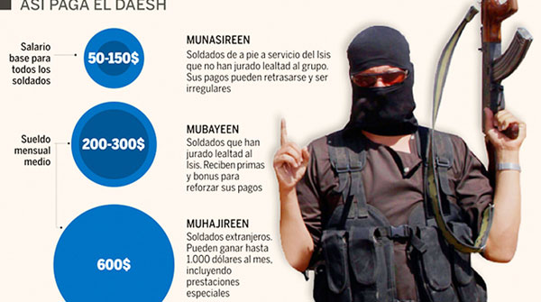 “Исламын улс” бүлгийн эгнээнд байлддаг гадаадын террорист сарын 150 ам.долларын үндсэн цалинтай. Үүн дээр нэг байрлалаас нөгөө рүү шилжихэд 200 долларын нэмэгдэл авдаг байна. Мөн цэргийн гутал, хувцсаар хангаж, дайчдын эхнэрүүдэд тэтгэмж олгодог аж. Гэрчүүдийн баталж буйгаар, “Исламын улс”-ын дайчны сарын орлого 800 ам.доллар хүрдэг бололтой. Тус бүлэг цагдаа, тагнуулын албаны ажилтан, татвар, торгууль цуглуулдаг дотоодын аюулгүйн албаны туслахуудаа цалинжуулдаг аж. Тэд дотоодын аюулгүй байдалдаа сард 15 сая ам.доллар зарцуулдаг болохыг тогтоогоод байна. “Исламын улс” бүлгийн цагдаагийн нууц алба буюу Амният нь халифатын газар нутгаас давж Турк, Иорданд хүртэл үйл ажиллагаа явуулж байна. Тэд утасны яриаг чагнах системд хөрөнгө оруулж байгаа мэдээлэл иржээ.