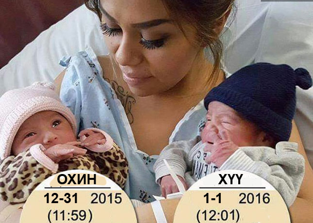 АНУ-ын Сан-Диего хотод нэг бүсгүй шинэ жилийн шөнө хоёр минутын зайтай амаржиж ихэр хүүхэд төрүүлжээ. Нэг нь 2015 онд, нөгөө нь 2016 онд төрсөн хэмээн АВС уламжлав. Тодруулбал, эхний хүүхэд 2015 оны арванхоёрдугаар сарын 31-ний 23:59-д, хоёр дахь нь 2016 оны нэгдүгээр сарын 1-ний 00.01 цагт мэндэлжээ. “Бид ихэр хүүхэдтэй болно гэдгээ мэдээгүй байсан.