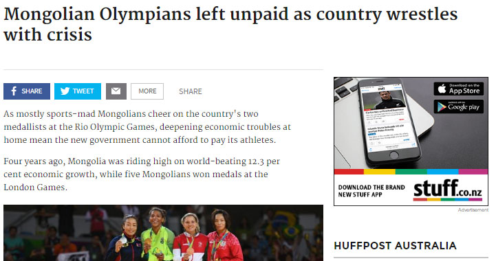 Спортод хорхойтой монголчууд Риогийн олимпийн хоёр медальтандаа уухайлан баяр хүргэх авч тус улсын шинэ Засгийн газар эдийн засгийн хүндрэл улам гүнзийрэх болсноос үүдэн тамирчиддаа мөнгө төлөх боломжгүйд хүрч байна.