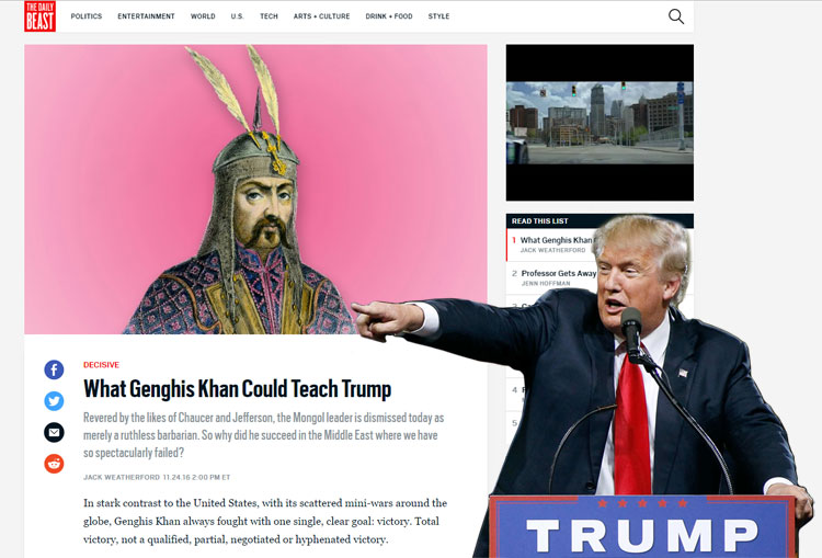 “Чингис хаан ба орчин үеийн ертөнц” бестселлер номоороо алдаршсан Ж.Везерфордын бичсэн энэхүү нийтлэлийг АНУ-ын “The Daily Beast” цахим сонин толилуулжээ. Тус нийтлэлийг бүрэн эхээр нь сийрүүлэн хүргэж байна.
