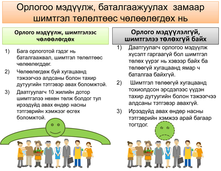Японы тэтгэврийн даатгалын тогтолцоонд байдаг хөнгөлөлтийн үйлчилгээ буюу даатгуулагчийн орлогын төвшинг харгалзан шимтгэлээс чөлөөлдөг системийг танилцуулъя. Манай улсын 20-иос дээш насны иргэд тэтгэврийн даатгалд хамрагдан шимтгэл төлөх ёстой. Харин оюутан, ажилгүй иргэдийн “орлогын мэдүүлэг”-ийг үндэслэж, мөн тэтгэврийн даатгалын байгууллага даатгуулагчдаас ирсэн хүсэлтийг шалгаад орлогын хэмжээ хүрэхгүй тохиолдолд шимтгэл төлөлтөөс чөлөөлдөг. Үүний тулд орлого батлах хоёр төрлийн бичиг баримтыг бүрдүүлнэ. Тухайлбал, татварын ерөнхий газраас гаргадаг даатгуулагчийн өмнөх жилийн орлогын баримт. Ажилгүй болсон эсвэл үйл ажиллагаагаа зогсоосныг гэрчлэх бичиг баримт юм.