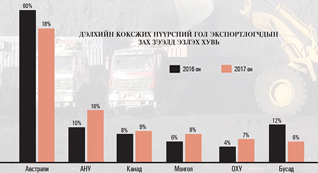Монголын нүүрсний экспортын гол зах зээл бол Хятад. Тус улсын хувьд оны эхний хагаст коксжих нүүрснийх нь импорт 29 сая тоннд хүрсэн байна. Энэ нь өнгөрсөн оны мөн үетэй харьцуулахад 19.4 хувиар буурчээ. Мөн Хятадын коксжих нүүрсний дотоодын олборлолт ч буурсан дүнтэй харагдаж байна. Хэдийгээр импорт буурсан ч гангийн үйлдвэрлэл нь өссөн аж. Дэлхийн гангийн холбоо Хятадын гангийн үйлдвэрлэл 6.5 хувиар өсч, 451.2 сая тоннд хүрсэн тухай мэдээлэв.Мөн Хятадын коксжих нүүрсний үйлдвэрлэл оны эхний хагаст 214 сая тонн болж буурсан нь мөн үетэй харьцуулсан үзүүлэлт юм. Хятадын хувьд агаарын бохирдлыг бууруулах, байгаль орчинд ээлтэй үйлдвэрлэл явуулахын тулд томоохон үйлдвэр, уурхайн хүчин чадлыг хумих, авто замаар эрдэс түүхий эд тээвэрлэхийг хязгаарлах бодлого баримтлан “ Цэнхэр тэнгэр “ хөтөлбөрийн хэрэгжилтийг чангатгахаар болжээ. Өөрөөр хэлбэл, дотоодын хуучин, үр ашиггүй уурхайнуудыг хаах бодлого тус улсын импортын эрэлтийг тодорхой хэмжээнд хязгаарлаж буй. Ингэснээр 2018-2020 он гэхэд Хэбэй мужид нүүрсний хэрэглээг 200 сая тонноор буулгахаар болсноо хэлээд байна. Түүнчлэн Хуанхуа болон Таншан боомтоос эрдэс түүхий эд, нүүрсийг зөвхөн төмөр зам болон усан замаар тээвэрлэдэг болохоор идэвхийлэн ажиллаж байна гэдгээ “Сoal Mongolia-2018” чуулганы индэрээс Хятадын коксжих нүүрсний зах зээл, эрэлт, нийлүүлэлт үнэ, өрсөлдөөн сэдвээр илтгэл тавьсан “Фэнвей Энержи Информэйшн Сервисез” компанийн дэд ерөнхийлөгч Сара Лиу мэдэгдэж байна. Ийнхүү Хятадын агаарын бохирдлыг бууруулах бодлоготой холбоотой үйл ажиллагаанууд Монгол Улсад шинэ дохио өгсөөр байгааг “Coal Mongolia-2018” чуулганы илтгэлээс харж болох юм.