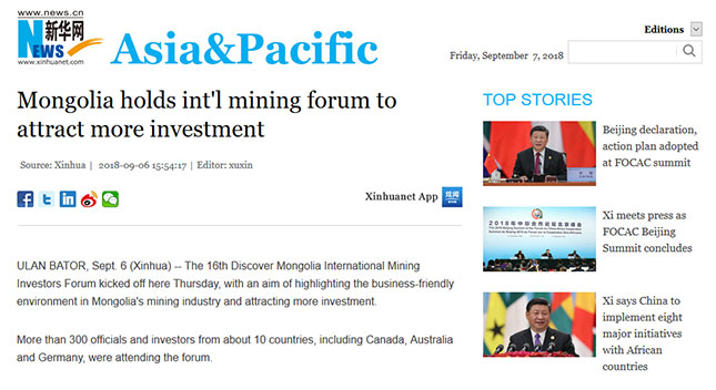 Монголын Уул Уурхайн Хөрөнгө Оруулагчдын 16 дахь удаагийн “Discover Mongolia-2018” чуулган болж байгаа тухай “Синьхуа” агентлаг мэдээлжээ.