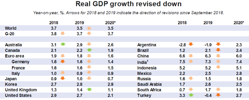Дэлхийн эдийн засгийн өсөлт хүчтэй хэвээр байгаа ч арилжааны хямралд орж, санхүүгийн хүндрэлд хүргэж болзошгүй эрсдэл гарч ирлээ гэж Эдийн засгийн хамтын ажиллагаа, хөгжлийн байгууллын тайланд дурджээ. Тайланд ирэх онд дэлхийн эдийн засгийн өсөлтийг 3.5 хувьд хүрнэ гэжээ. Түүнчлэн худалдааны маргаан даамжрах, эдийн засагт тодорхойгүй байдал нэмэгдэхийн хэрээр 2021 он гэхэд дэлхийн эдийн засаг 0.8 хувиар буурах эрсдэлтэй гэж Эдийн засгийн хамтын ажиллагаа, хөгжлийн байгууллагын шинжээчид үзэж байна. Дэлхийн эдийн засгийг тогтвортой хөгжүүлэхэд илүү сайн, үр дүнтэй, цогц хамтын ажиллагаа шаардлагатай хэмээн шинжээчид тэмдэглэсэн байна. ЭЗХАХБ-ын Ерөнхий нарийн бичгийн дарга Ангел Груриа “Дэлхийн эдийн засгийн өсөлт энэ онд 3.7 хувьтай байгаа бол 2019, 2020 онд 3.5 хувь болж саарах төлөвтэй байна. Үүний гол шалтгаан нь хамтын ажиллагаа суларсантай холбоотой. Худалдааны үнийн бодлого, цаашид дүрмээ чангатгасан ямар арга хэмжээ авах нь тодорхойгүй байгаа нь худалдааны өсөлтийг бууруулах, дэлхийн хэмжээнд хөрөнгө оруулалт, хөдөлмөрийн зах зээл, иргэдийн амьжиргааны төвшинд сөрөг нөлөөтэй. Дэлхийн эдийн засгийг тогтвортой хөгжүүлэхэд илүү сайн, үр дүнтэй, цогц хамтын ажиллагаа шаардлагатай” гэж мэдэгдлээ. Мөн тэрээр бодлого боловсруулагчид олон улсын дүрэм журамд суурилсан худалдааны системд итгэх итгэлийг сэргээж, өсөлтийг дээшлүүлж, амьжиргааны төвшинг нэмэгдүүлэх шинэчлэлийг хэрэгжүүлэх ялангуяа, эмзэг бүлгийн хүмүүст дэмжлэг үзүүлэхийг уриалж байна гэжээ. Түүнчлэн 2019 онд эдийн засаг саарсан төсөөлөл нь Турк, Аргентин, Бразил зэрэг хөгжиж буй зах зээлээс улам бүр доройтох хандлагатай байгаа аж. Тиймээс 2020 онд цаашид буурах хандлагатай байгаа учраас урт хугацаанд арилжаа хийж, санхүүгийн хямралыг багасгахад хүргэж буй аж.