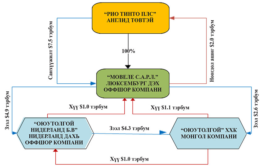 Ингээд “Мовеле С.А.Р.Л” нь “Оюутолгой” ХХК-иас шууд очсон 1.1 тэрбум, “Оюутолгой Нидерланд Б.В”-аас шилжсэн 1.0 тэрбум ам.долларыг нийлүүлээд 2.1 тэрбум ам.долларыг төвлөрүүлчихэж байгаа юм. “Мовеле С.А.Р.Л” компаниас энэ 2.1 тэрбум ам.долларын 2.0 тэрбум нь толгой компани болох “Рио Тинто Плс” руугаа очжээ. Энэ мөнгө бол “Рио Тинто”-гийн “сүлжсэн” зээлийн хүү буюу Оюутолгойн орлого юм.