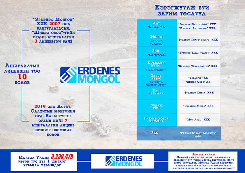 “Эрдэнэс-Монгол” компанийг анх 2007 онд байгуулсан, стратегийн ордуудыг ашиглах, эдийн засгийн эргэлтэд оруулах харилцаанд төрийг төлөөлөх үндсэн үүрэгтэй. Гэвч тус компани үүсэн байгуулагдсанаасаа хойш 2019 он хүртэл зөвхөн Шивээ-Овоогийн орд газарт ашиглалтын гурван лицензтэй байв. Ердөө гуравхан лиценз эзэмшдэг байлаа.