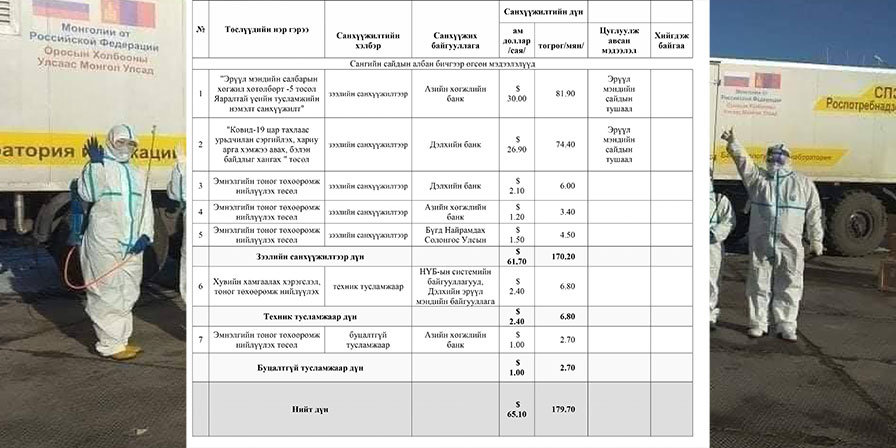 Засгийн газраас “COVID-19-ын цар тахлаас сэргийлэх, тэмцэх, нийгэм, эдийн засагт үзүүлэх сөрөг нөлөөллийг бууруулах тухай хууль”-ийг энэ оны дөрөвдүгээр сард батлан хэрэгжүүлж эхэлсэн. Одоогоор гадаад орны Засгийн газар болон олон улсын байгууллагуудын зээл, буцалтгүй тусламжаар нийт 179.9 тэрбум төгрөгийн санхүүжилт авчээ. Гэвч эрүүл мэндийн салбарт нэн шаардлагатай тоног төхөөрөмж, эм, эмнэлгийн хэрэгсэл, хувийн хамгаалах хэрэгсэл, оношлуурын санхүүжилтийг шийдээд байна гэхээс өөрөөр нарийн зарцуулалтын мэдээлэл алга. Дээрхи хуулийн хүрээнд түр хороо байгуулагдсан. Түр хороо мэдээллээ ил тод тавихгүй байгаад хамаг учир байна. Түүнчлэн Сангийн яамны зээл тусламжийн мэдээллийн сайтаас өөр Засгийн газраас гаргасан нэгдсэн мэдээллийн сан ч алга. Сангийн яамны сайтад зээл, тусламж, хандиваар ирсэн мөнгөний санхүүжилт УОК, Эрүүл мэндийн яам руу олгосон мэдээлэл байгаа ч энэ хоёр байгуулага зарцуулалтын нарийн мэдээлэлээ ил тод мэдээлж, шилэн дансандаа байршуулахгүй байна. Өөрөөр хэлбэл, Сангийн яам зээл тусламжийн нэгдсэн мэдээллээ өнгөрсөн гуравдугаар сараас өнөөдрийг хүртэл ил тод байршуулаагүй. Түүнчлэн Эрүүл мэндийн яам нийт хандив тусламж болон санхүүгийн дэмжлэг төсвийн дахин хуваарилалтыг ил тод мэдээлэхгүй байсаар байна.