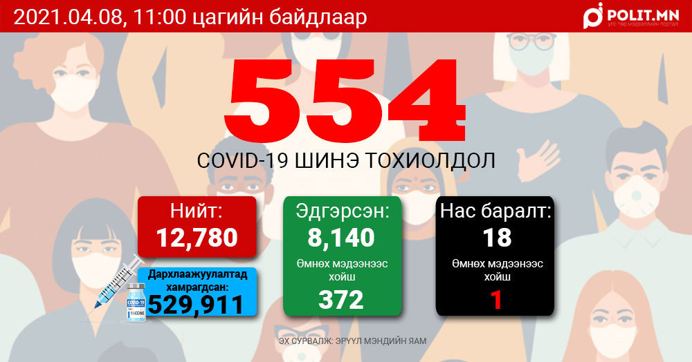 Сүүлийн 24 цагийн хугацаанд 11116 хүний сорьцод шинжилгээ хийхэд халдварын 554 шинэ тохиолдол бүртгэгдлээ. Ингэснээр Монгол Улсад бүртгэгдсэн коронавируст халдварын нийт тохиолдол 12870 боллоо.Мөн хугацаанд 372 хүн эдгэрч эмнэлгээс гарсан бол нэг хүн нас барсан харамсалтай мэдээ байна.